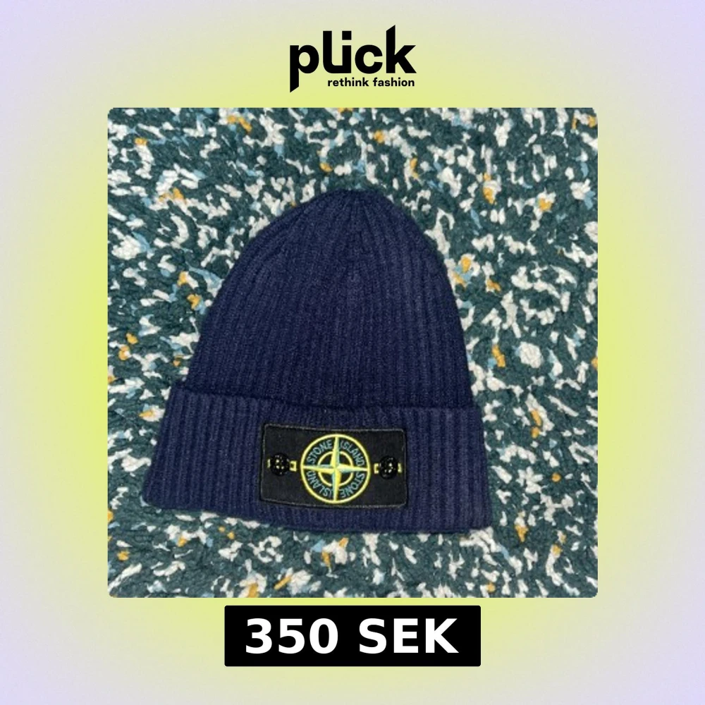 Mörkblå stickad mössa från Stone Island med klassisk broderad logotyp framtill. Mössan är ribbstickad och har en uppvikt kant. Perfekt för kyliga dagar och snygg till streetwear-stilen. One size. Helt oanvänd