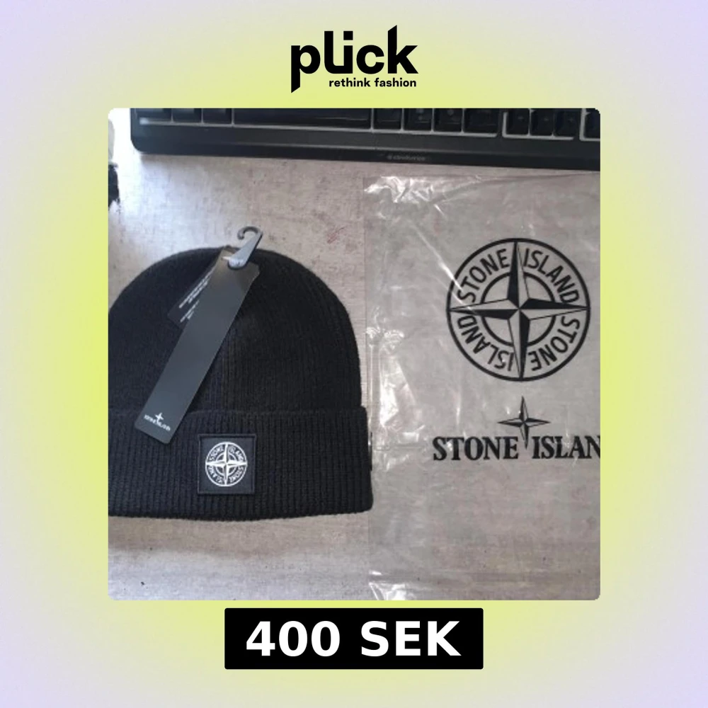 Snygg svart stickad mössa från Stone Island med deras ikoniska logga framtill. Perfekt för att hålla värmen under kyliga dagar. Mössan har en ribbad design och kommer med originalförpackning.
