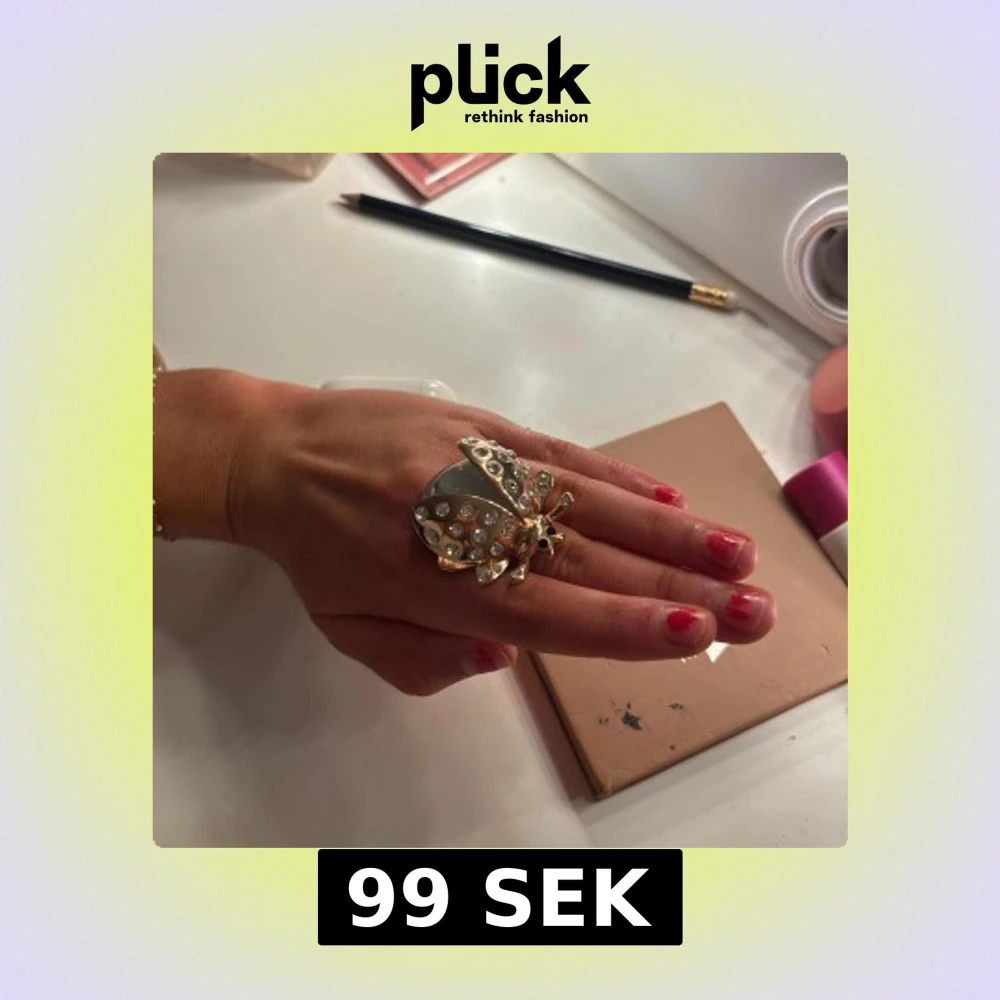 Unik och iögonfallande ring i form av en nyckelpiga, dekorerad med glittrande stenar. Ringen är i guld- och silverfärg med svarta detaljer på huvudet. Perfekt för dig som vill sticka ut och addera lite extra bling till din stil. jätte jätte snygg köpt i Grekland