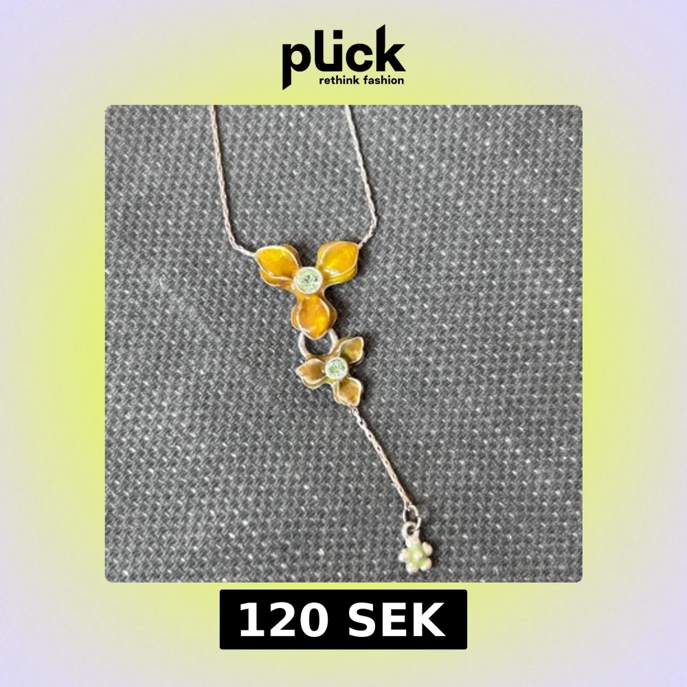 Säljer ett unikt halsband med silverkedja och två blommor Blommorna har glittrande stenar i mitten och en liten hängande blomdetalj längst ner. Perfekt för dig som gillar färgglada accessoarer!