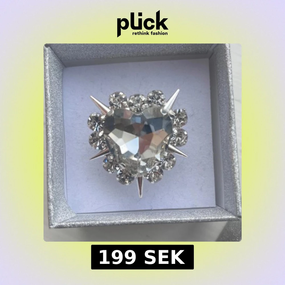 En glittrig silverfärgad ring med en stor hjärtformad kristall i mitten, omgiven av mindre kristaller och spetsiga detaljer. Perfekt för att ge en extra touch av glamour. Älskar!! ❤️Aldrig använd