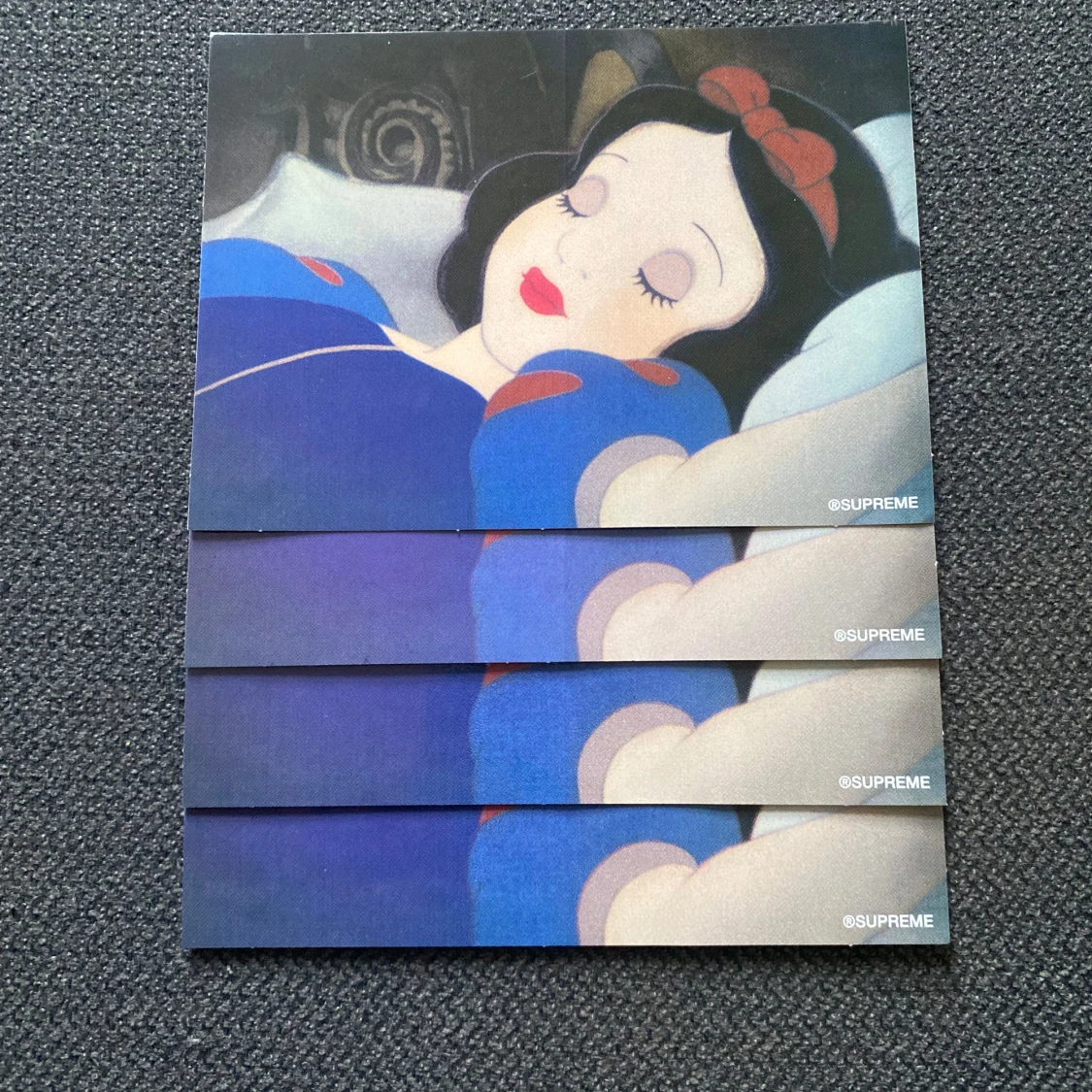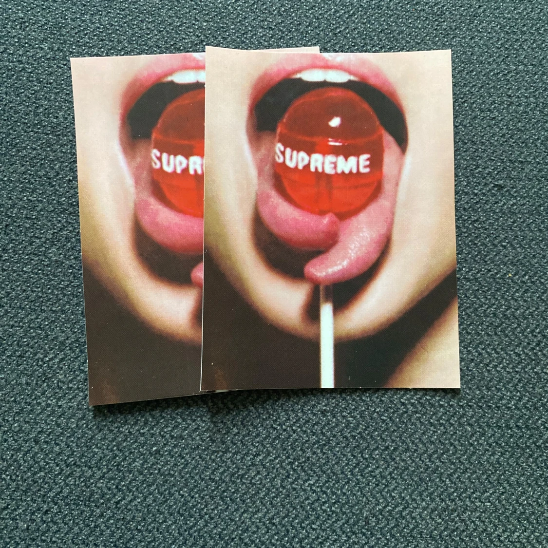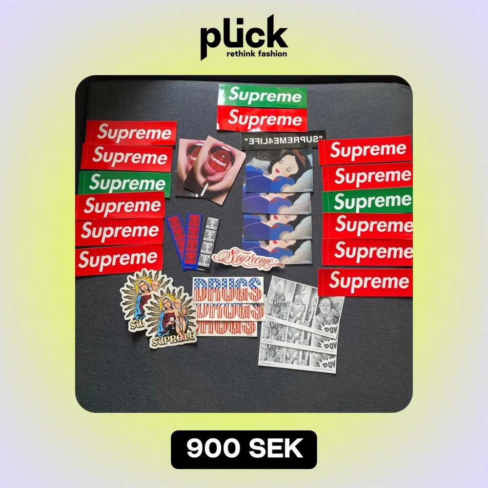 Säljer en samling av Supreme klistermärken och kort. Inkluderar klassiska röda och gröna Supreme klistermärken samt unika kort med motiv av Snövit. Perfekt för att dekorera din laptop, skateboard eller vägg. Alla i nytt skick och redo att användas!