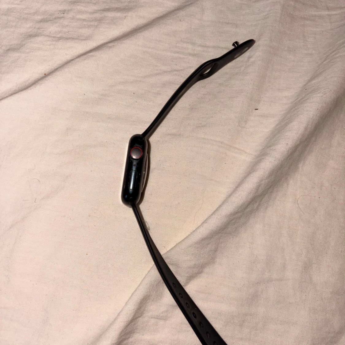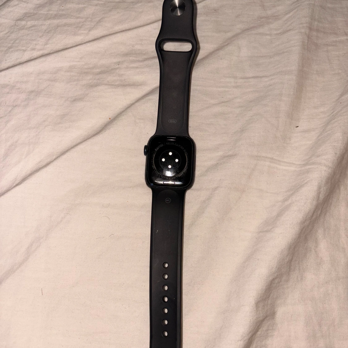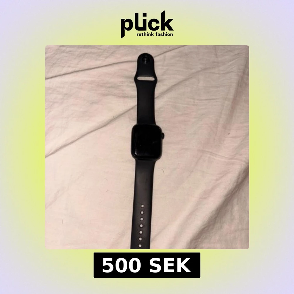 Snygg svart Apple Watch med fyrkantig urtavla och mjukt silikonarmband. Klockan har en modern och stilren design med digital krona på sidan. Perfekt för dig som gillar teknik och vill ha koll på notiser och hälsa direkt på handleden.