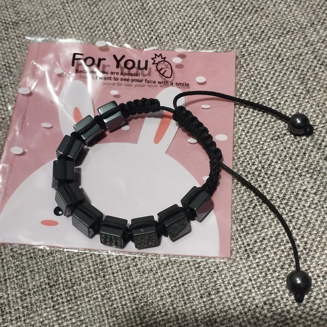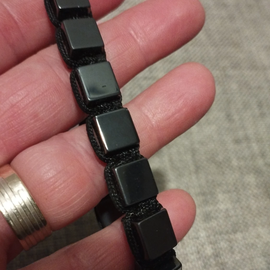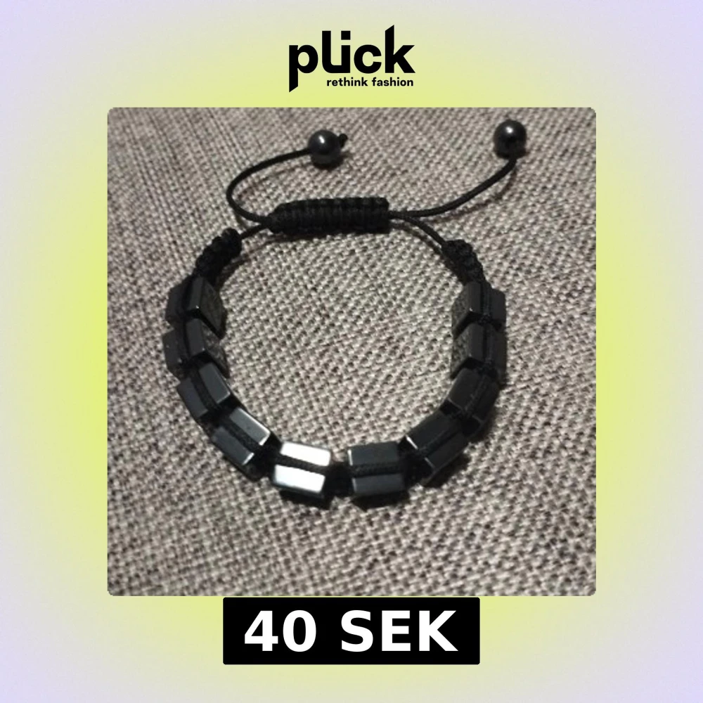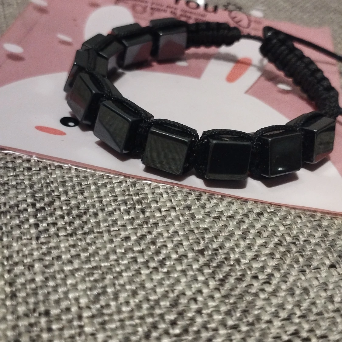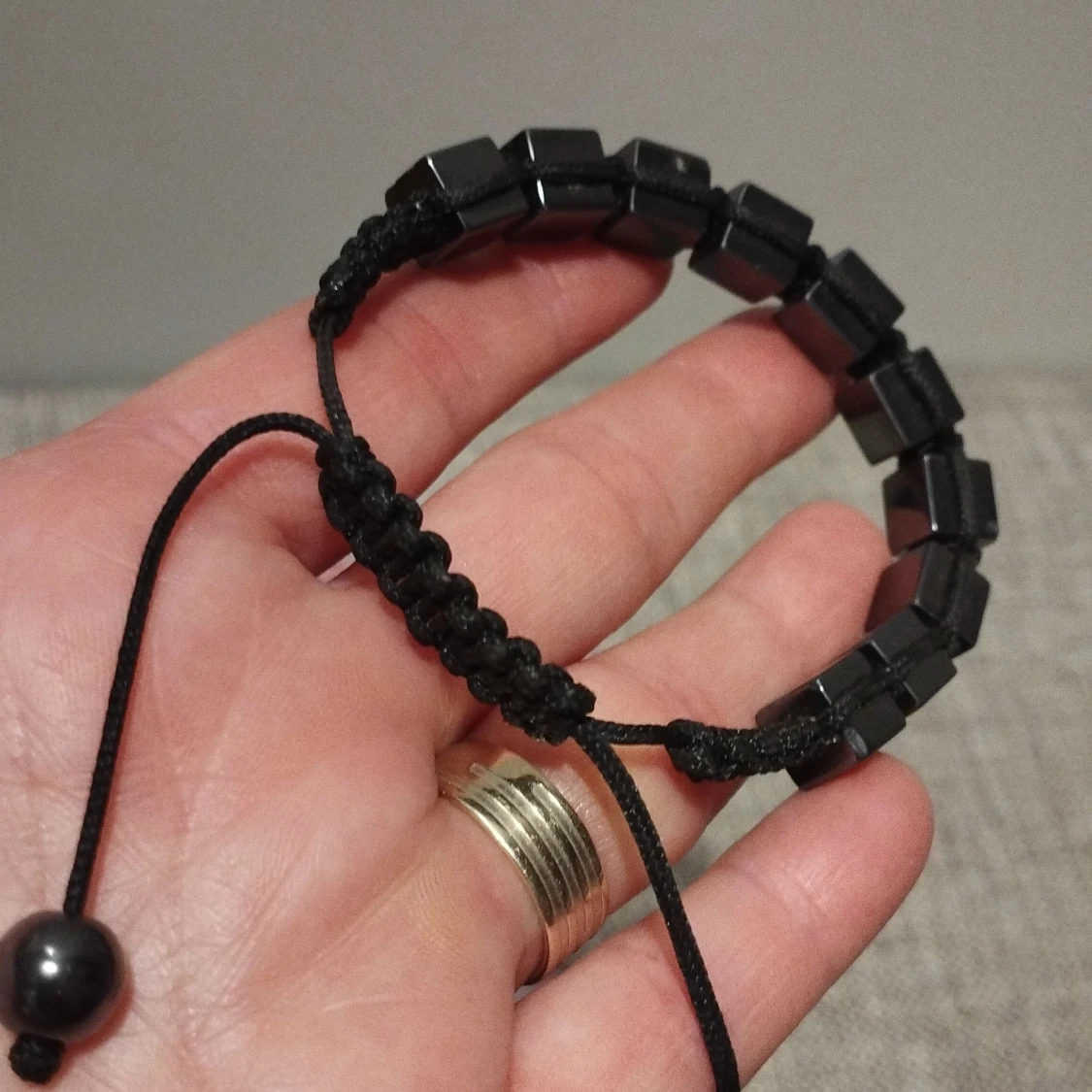 Snyggt svart armband med fyrkantiga pärlor och justerbar snörning. Perfekt för att ge en stilren touch till din outfit. Armbandet har en enkel men elegant design med svarta pärlor som reflekterar ljuset fint.