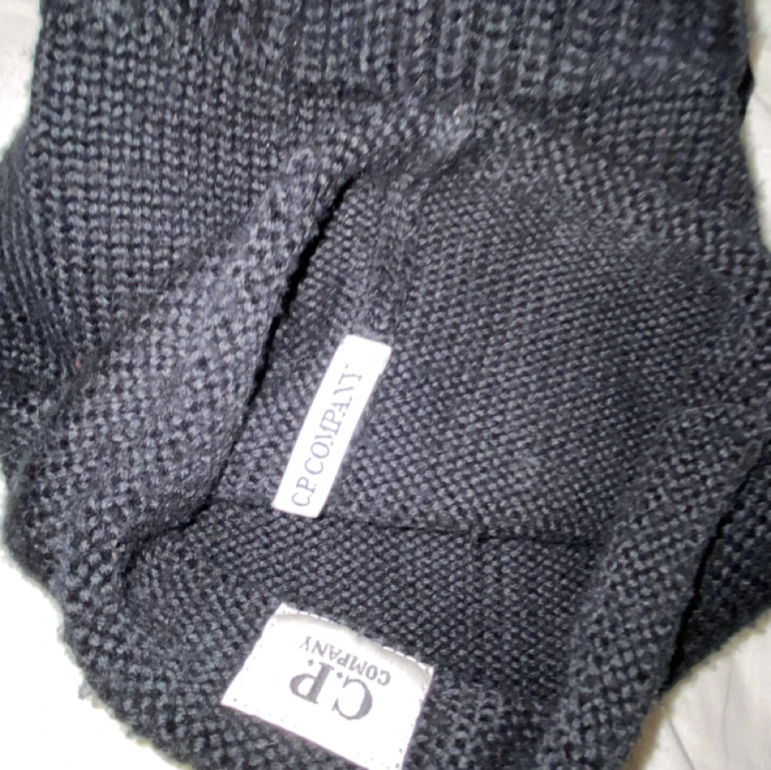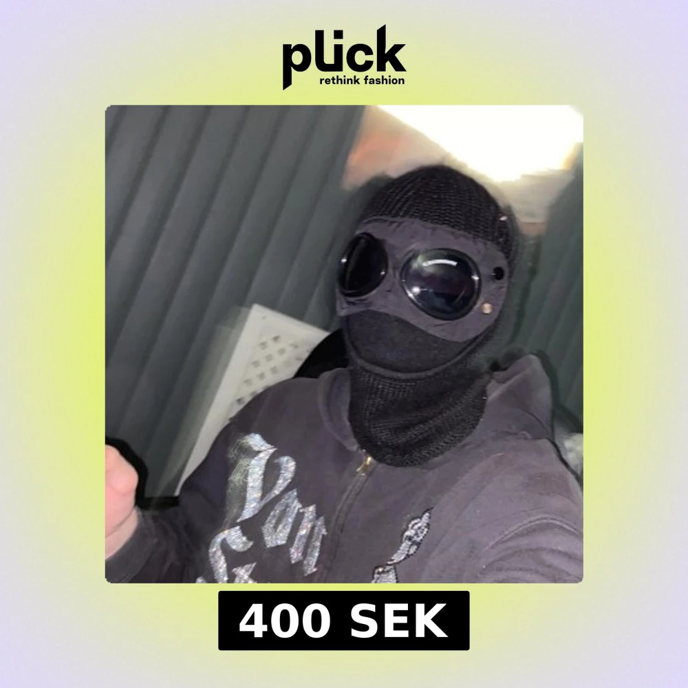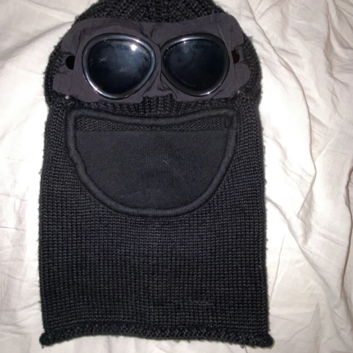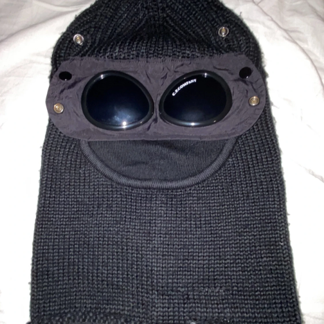 Unik svart balaclava från C.P. Company med inbyggda svarta goggles och stickad design. Huvan täcker hela huvudet och har en cool, futuristisk vibe. Perfekt för dig som vill sticka ut och hålla dig varm med stil. No size