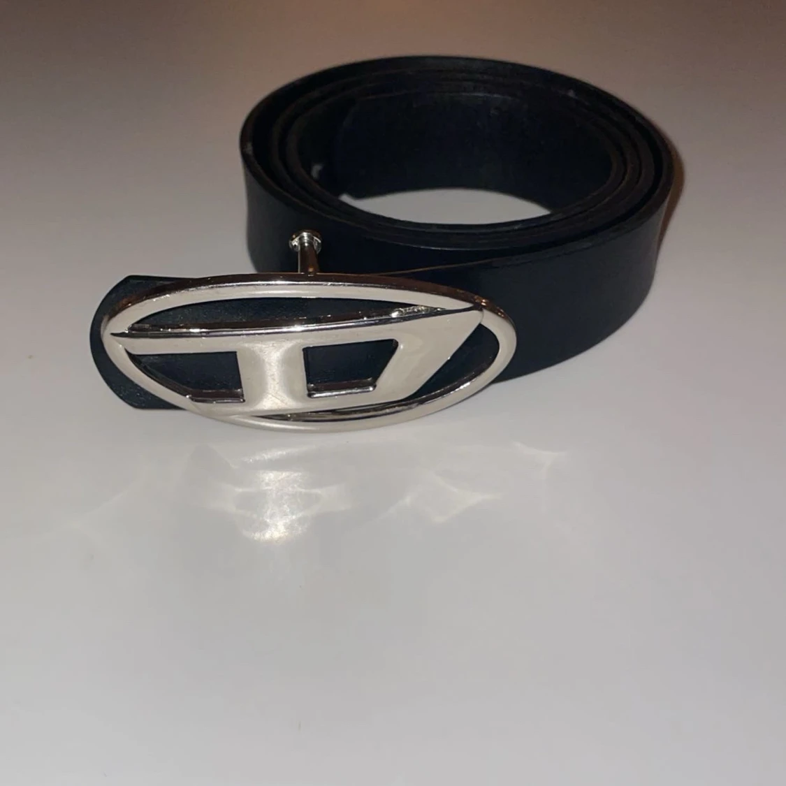 Snyggt svart Diesel bälte med ett unikt silverfärgat spänne i metall. Perfekt för att ge din outfit en stilren touch. Bältet har flera justerbara hål för bästa passform.