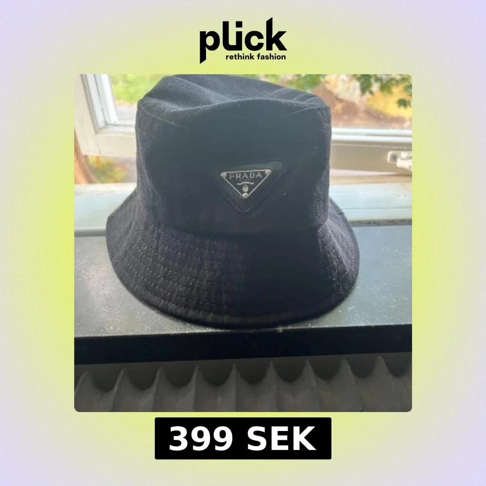 Stilren svart bucket hat från Prada med klassisk siluett och ikonisk metallogo framtill. Hatten är tillverkad i ett mjukt tyg som ger en avslappnad vibe och passar perfekt till streetwear eller när du vill lyfta din outfit.