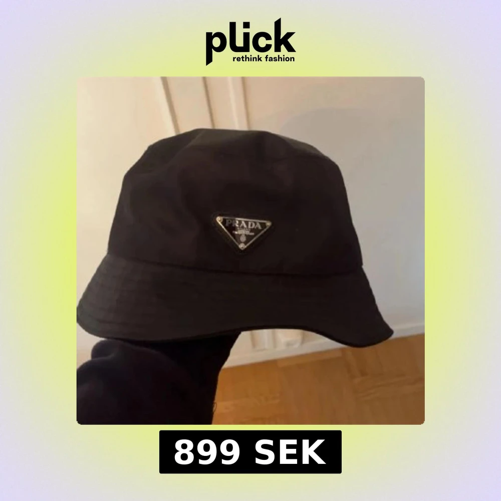 Svart bucket hat från Prada med ikonisk metalltriangel framtill. Snygg och stilren design som ger en cool vibe till din outfit. Nytt skick, nypris 4000kr