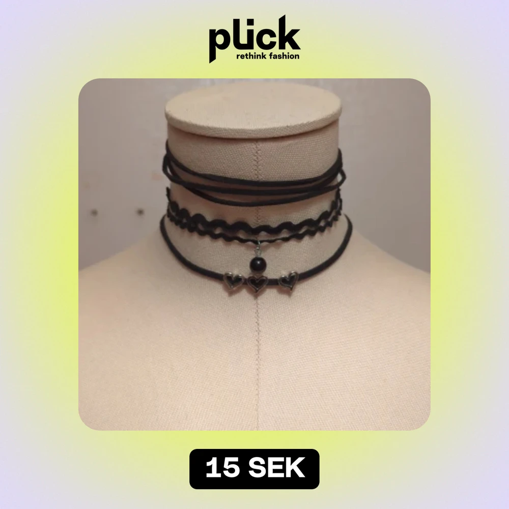 Säljer ett set med tre svarta chokerhalsband. Det ena är ett enkelt band, det andra har ett vågigt mönster med en svart pärla, och det tredje har små silverfärgade hjärtan. Perfekt för att ge en edgy touch till din outfit!