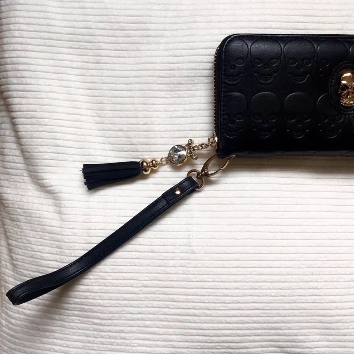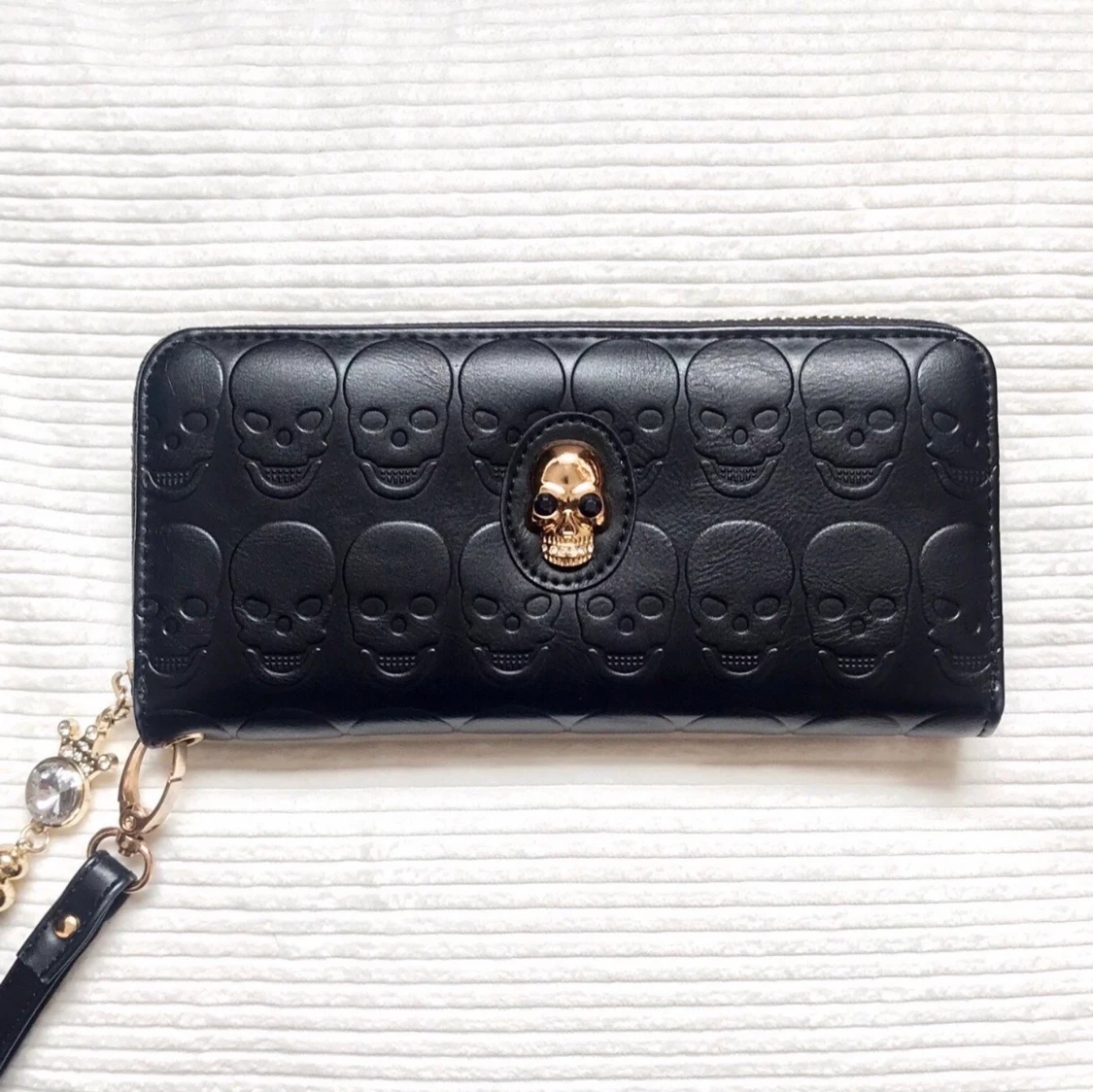 Svart plånbok/clutch med dödskalledetaljer. Kan också användas som en clutch med den avtagbara remen. Guldiga detaljer. Läderimitation. Perfekt skick (använd 1-2 gånger).