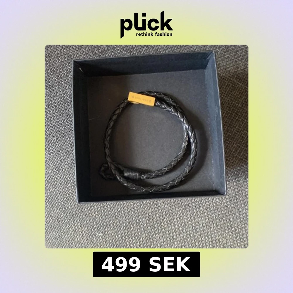 Stilrent svart armband från Skultuna i flätat skinn med en snygg guldfärgad detalj där märket står ingraverat. Perfekt accessoar för en cool och enkel look.