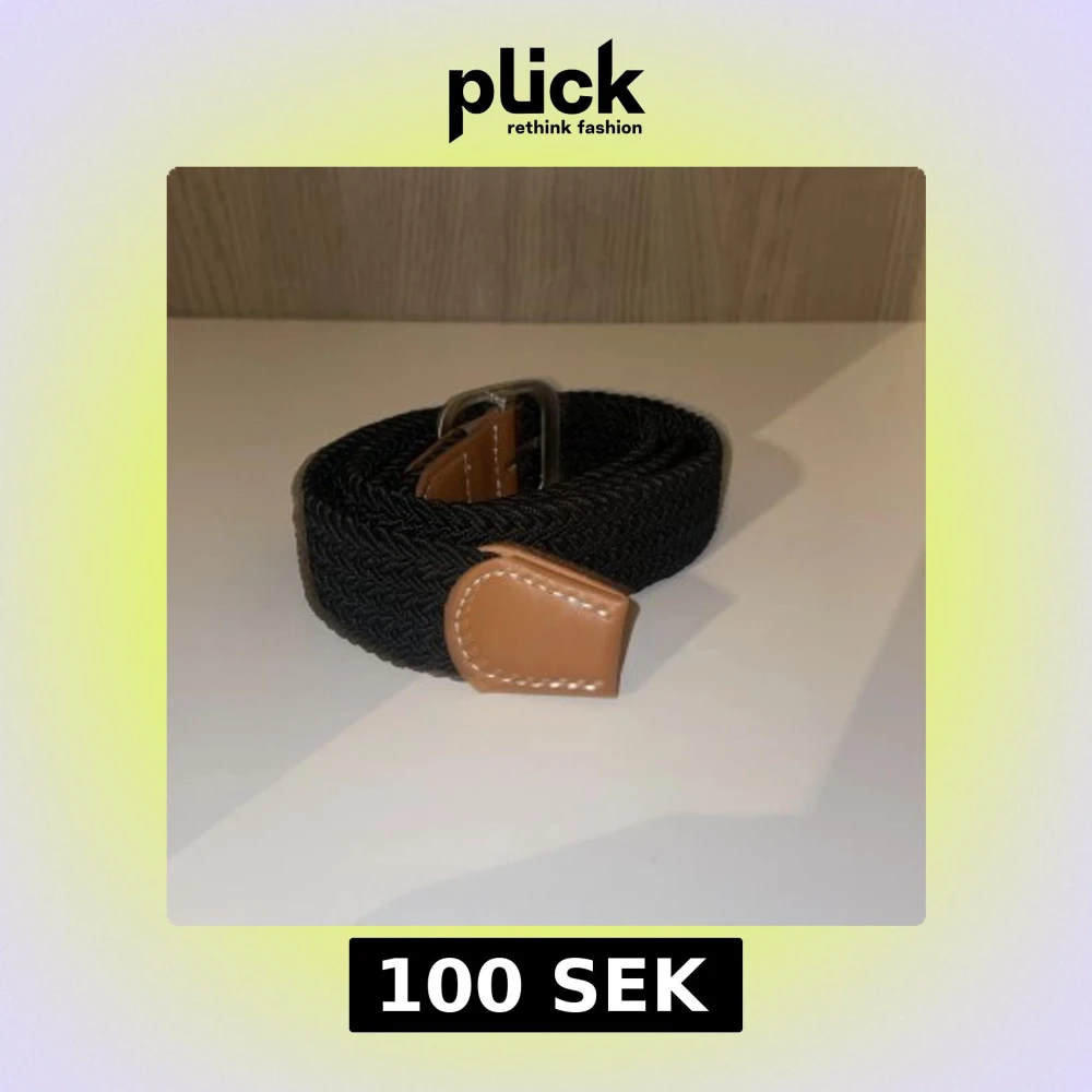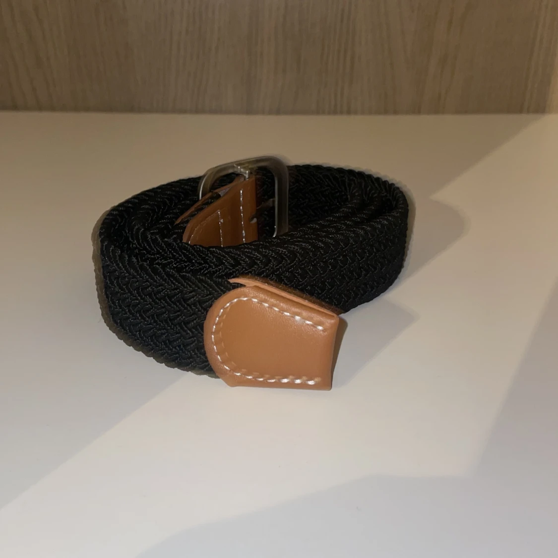 Snyggt svart flätat bälte med bruna skinn-detaljer och silverfärgat spänne. 85 cm. Aldrig använt.
