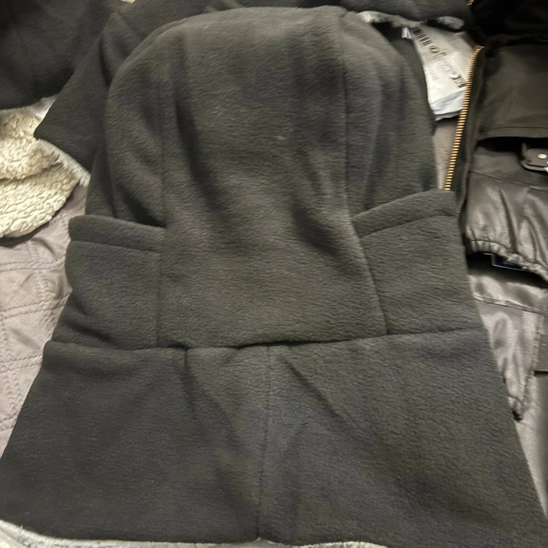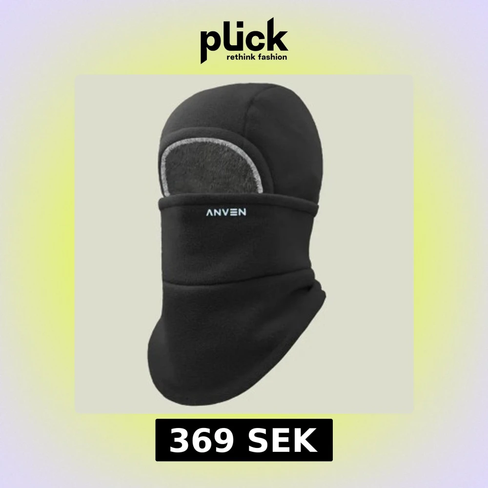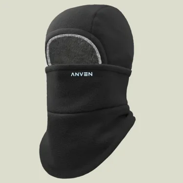 Säljer en svart balaclava från Anven i mjuk fleece. Huvan täcker hela huvudet och halsen, med grå kant runt ansiktsöppningen. Perfekt för kalla vinterdagar och outdoor-aktiviteter. Snygg, enkel design med Anven-logga framtill.