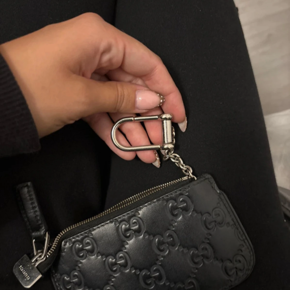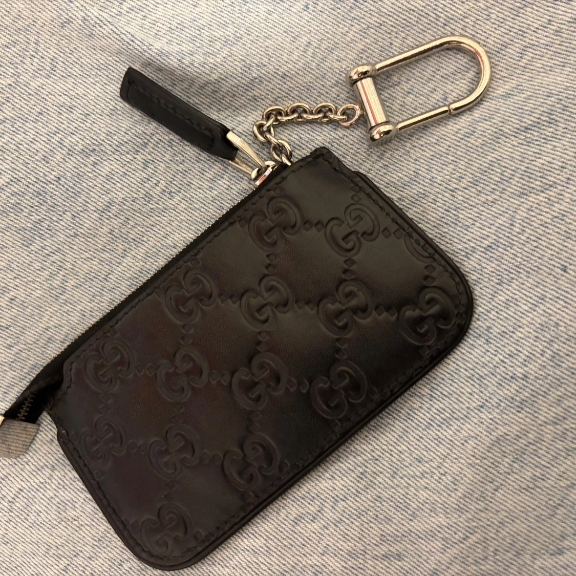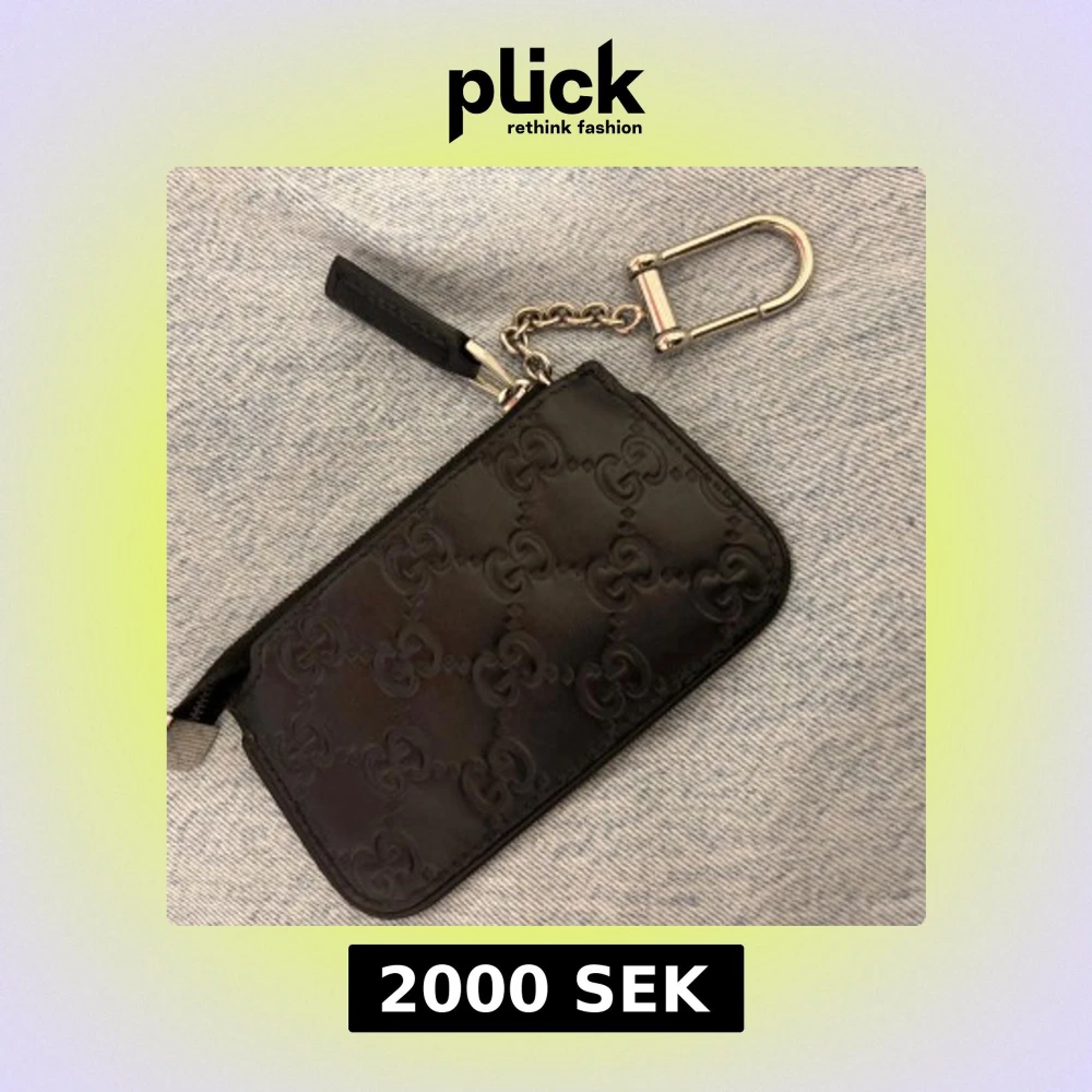 Snygg svart plånbok från Gucci i äkta skinn med präglat GG-mönster över hela ytan. Praktisk dragkedja och silverfärgad kedja med karbinhake, perfekt att fästa i väskan eller byxan. Stilren och lyxig accessoar för dig som gillar designer.