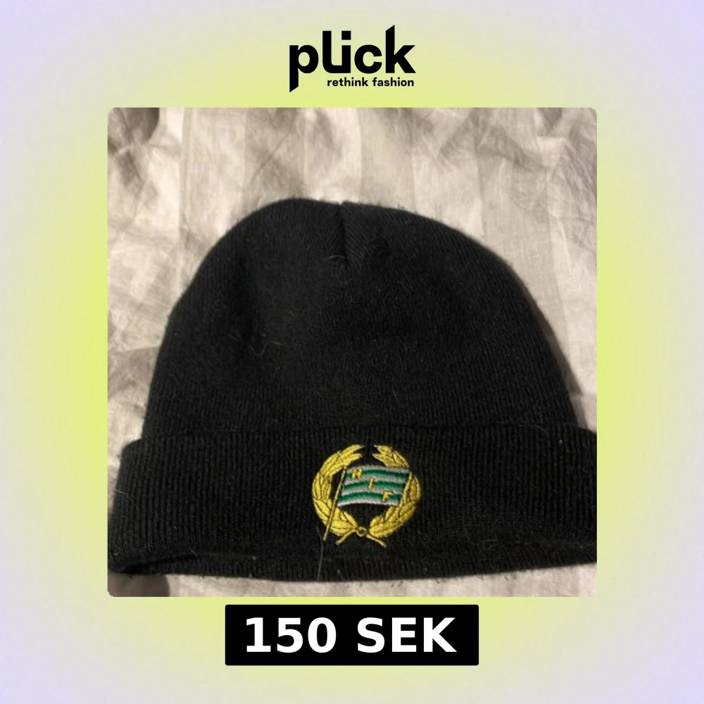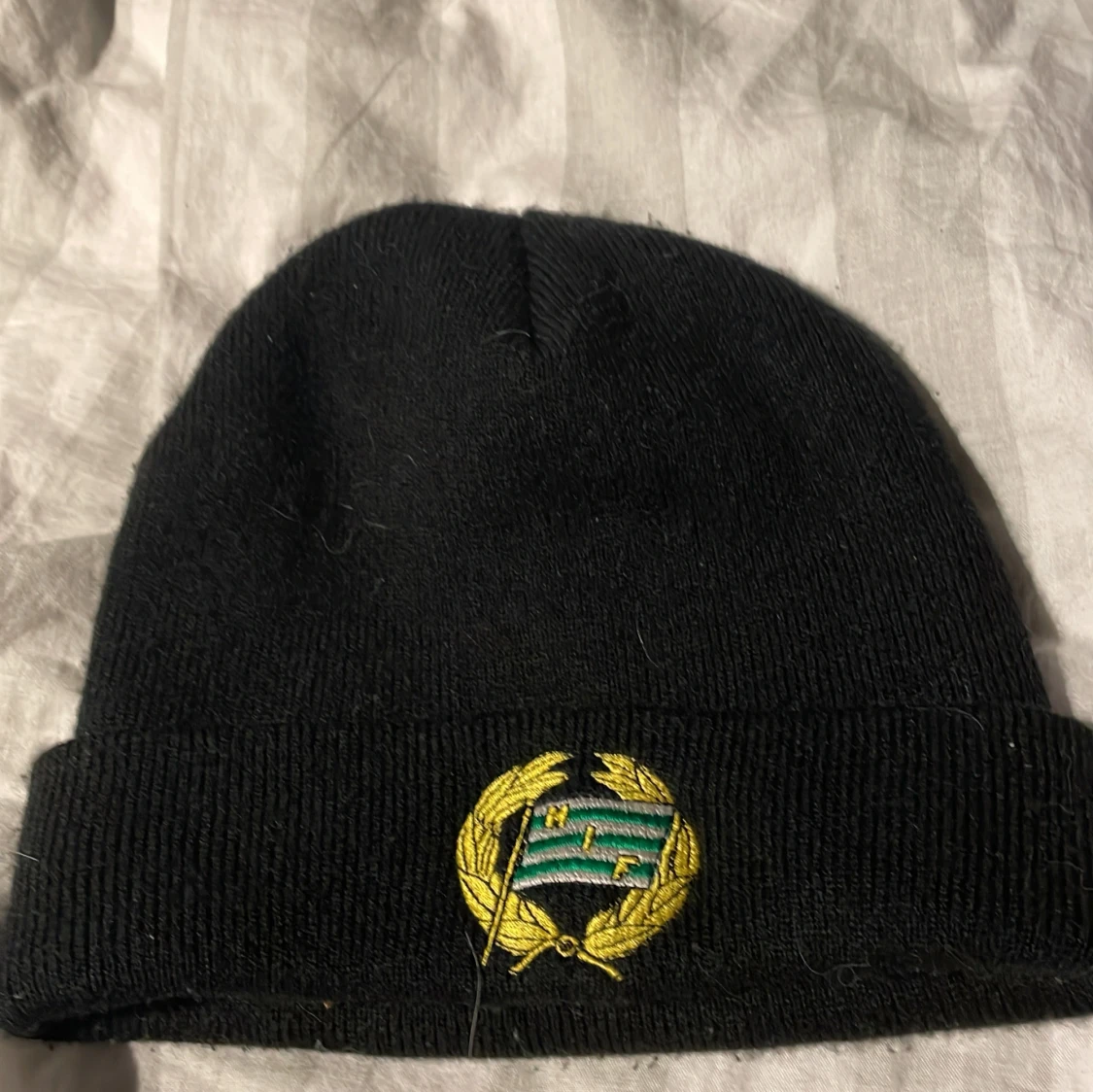 Svart ribbstickad mössa med broderad Hammarby IF-logga framtill i grönt, gult och vitt. Klassisk form med uppvikt kant, perfekt för att visa ditt stöd för laget under kalla dagar.