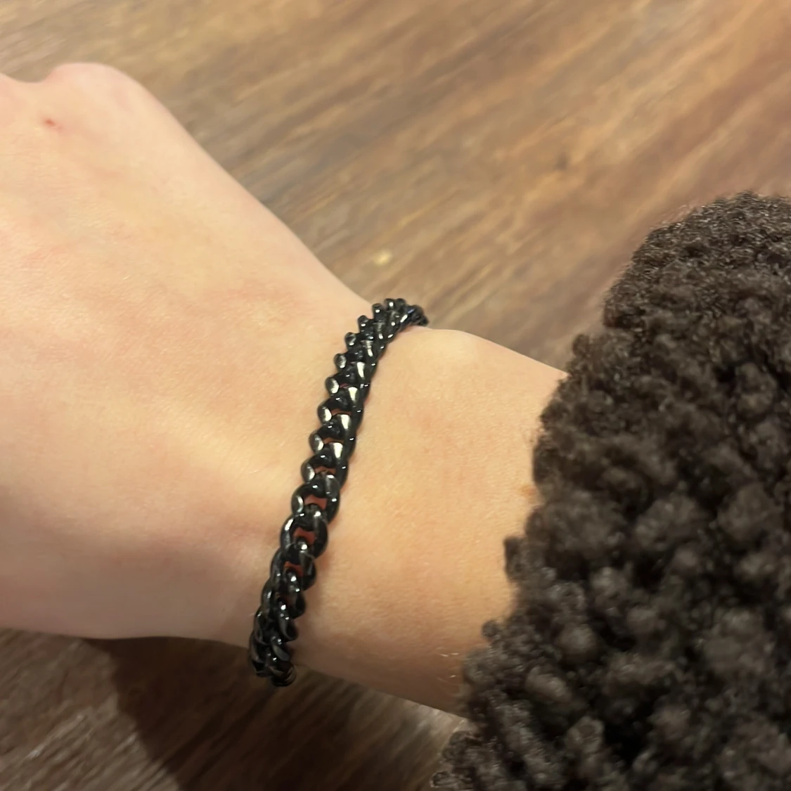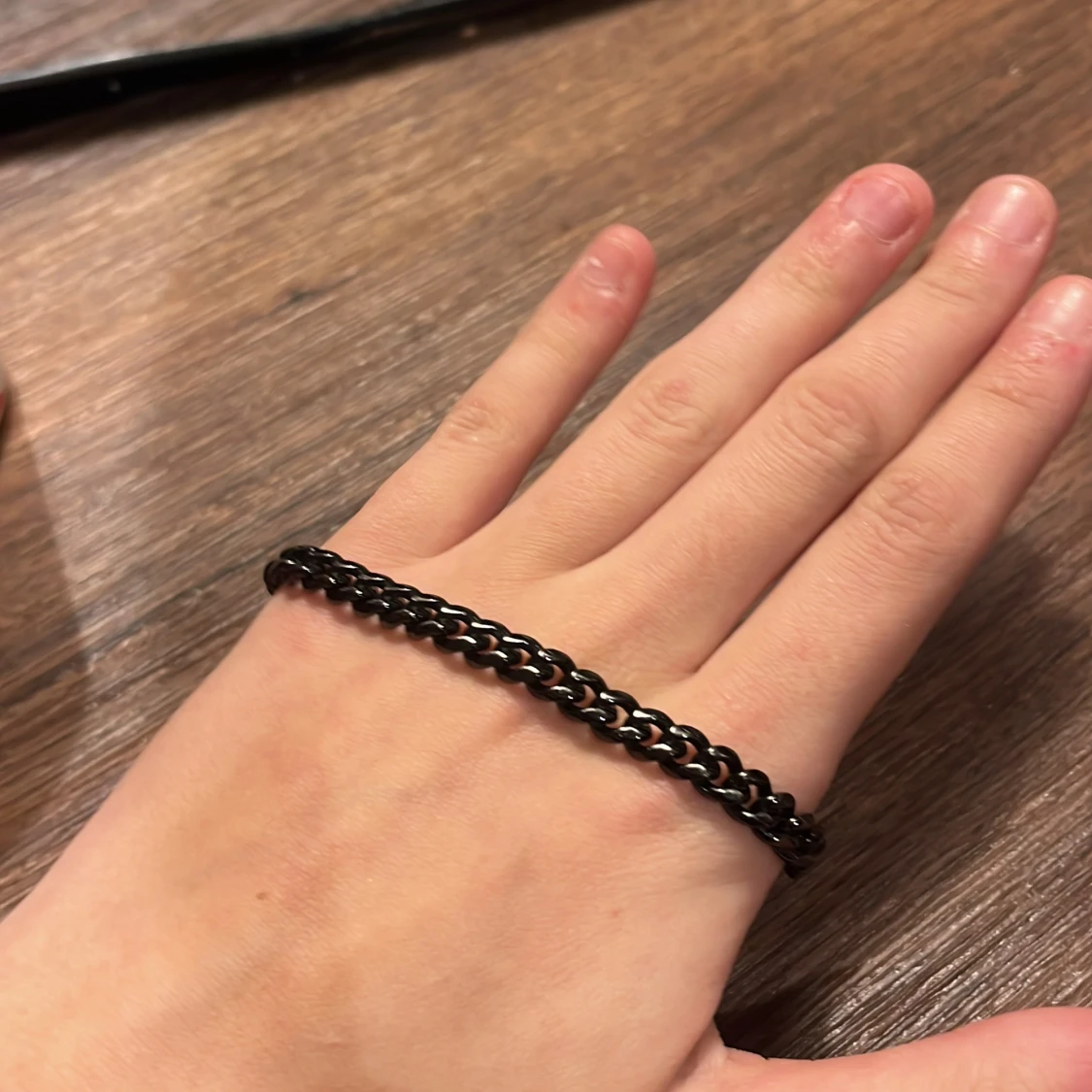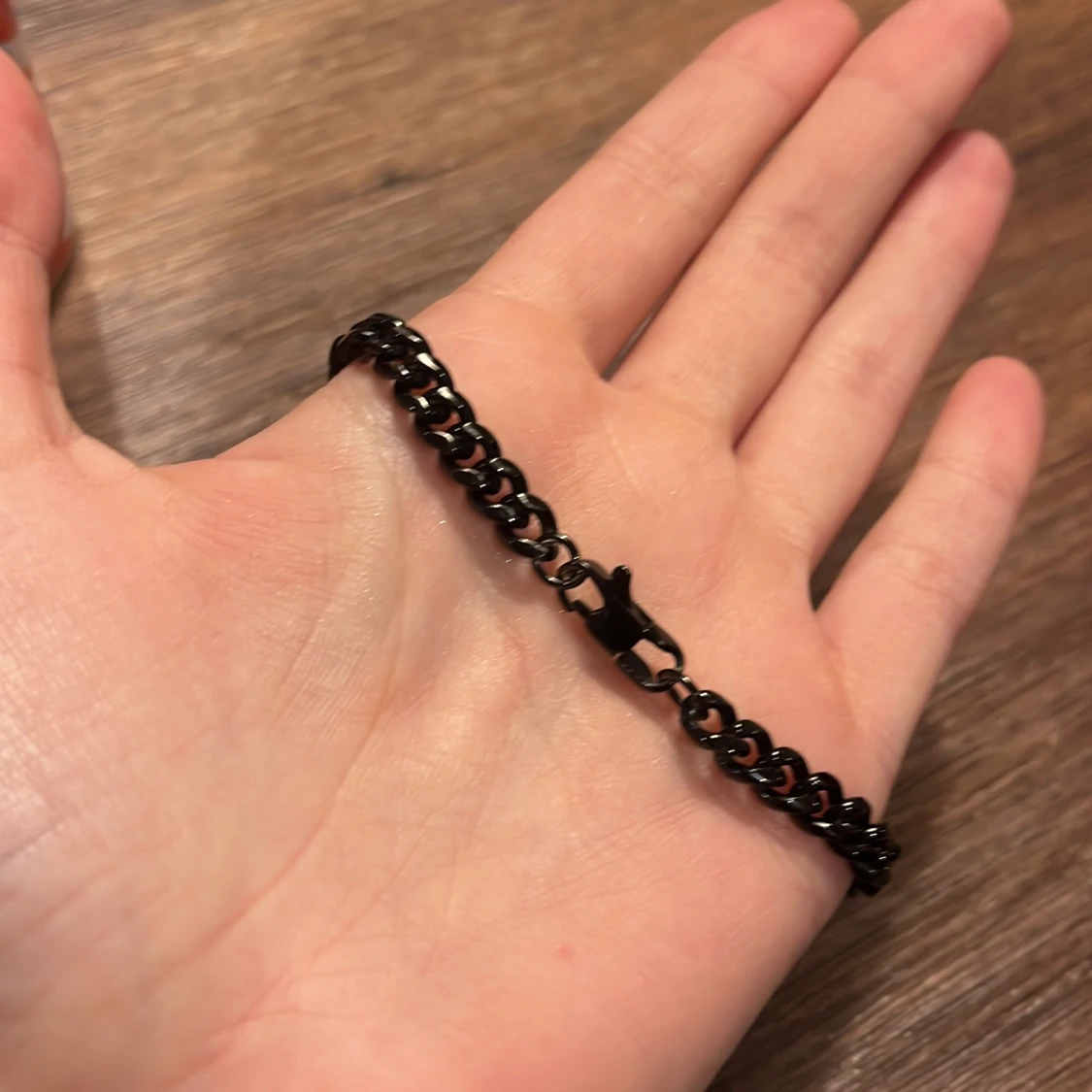 Stilrent svart armband med kedjelänkar i metall. Armbandet har en klassisk karbinhake som lås och en glansig finish som ger en cool vibe. Perfekt accessoar för att lyfta din outfit med en edgy touch. Den rostar inte