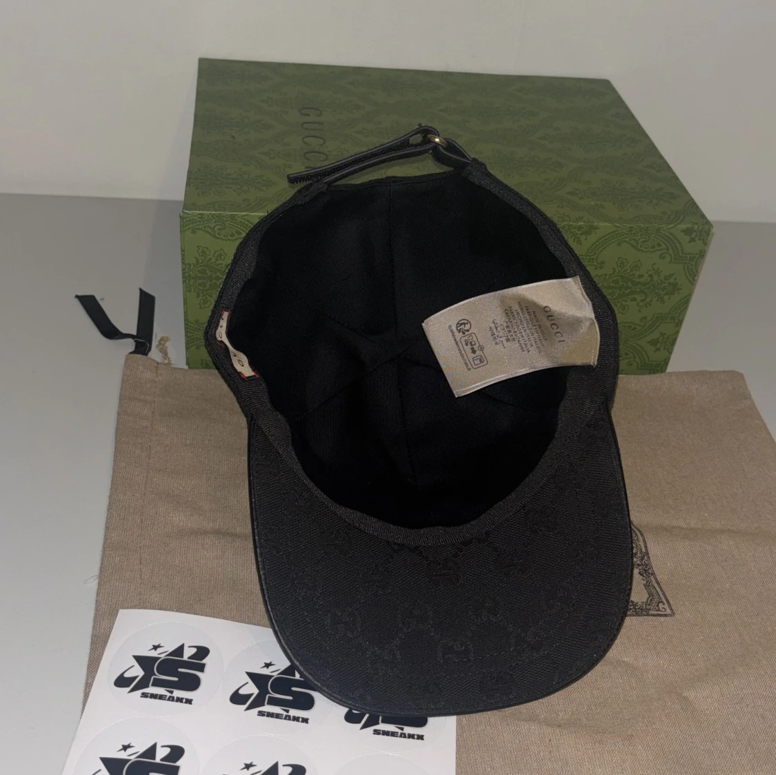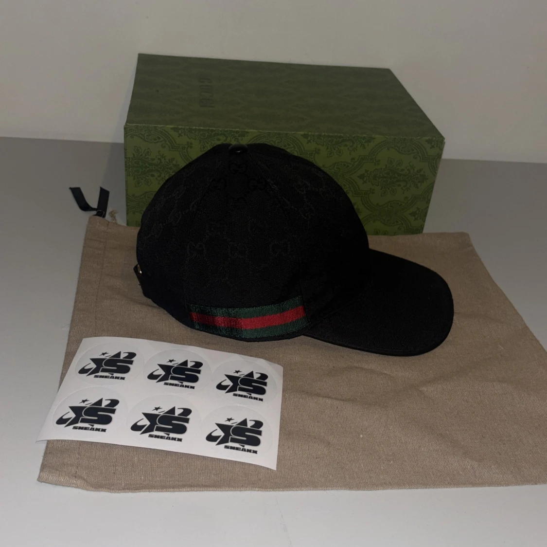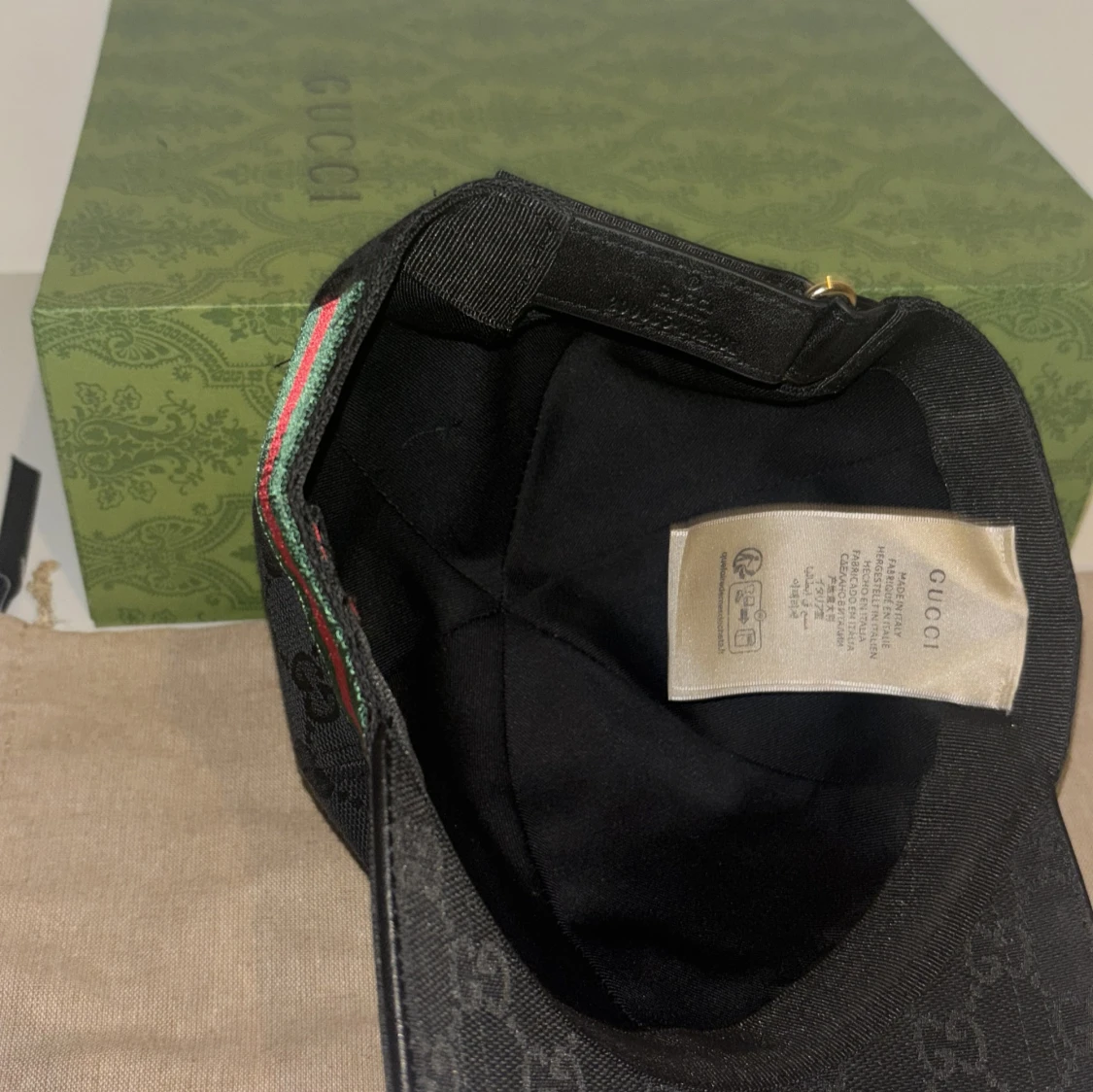 Snygg svart keps från Gucci med diskret mönster och klassiska gröna och röda ränder på sidan. Perfekt för att ge din outfit en lyxig touch. Finns i S M L