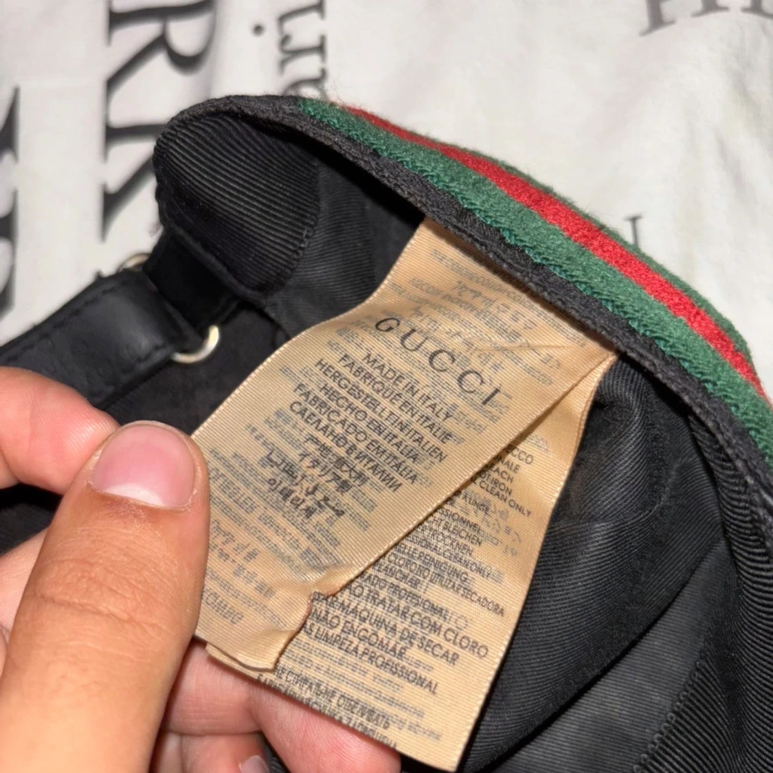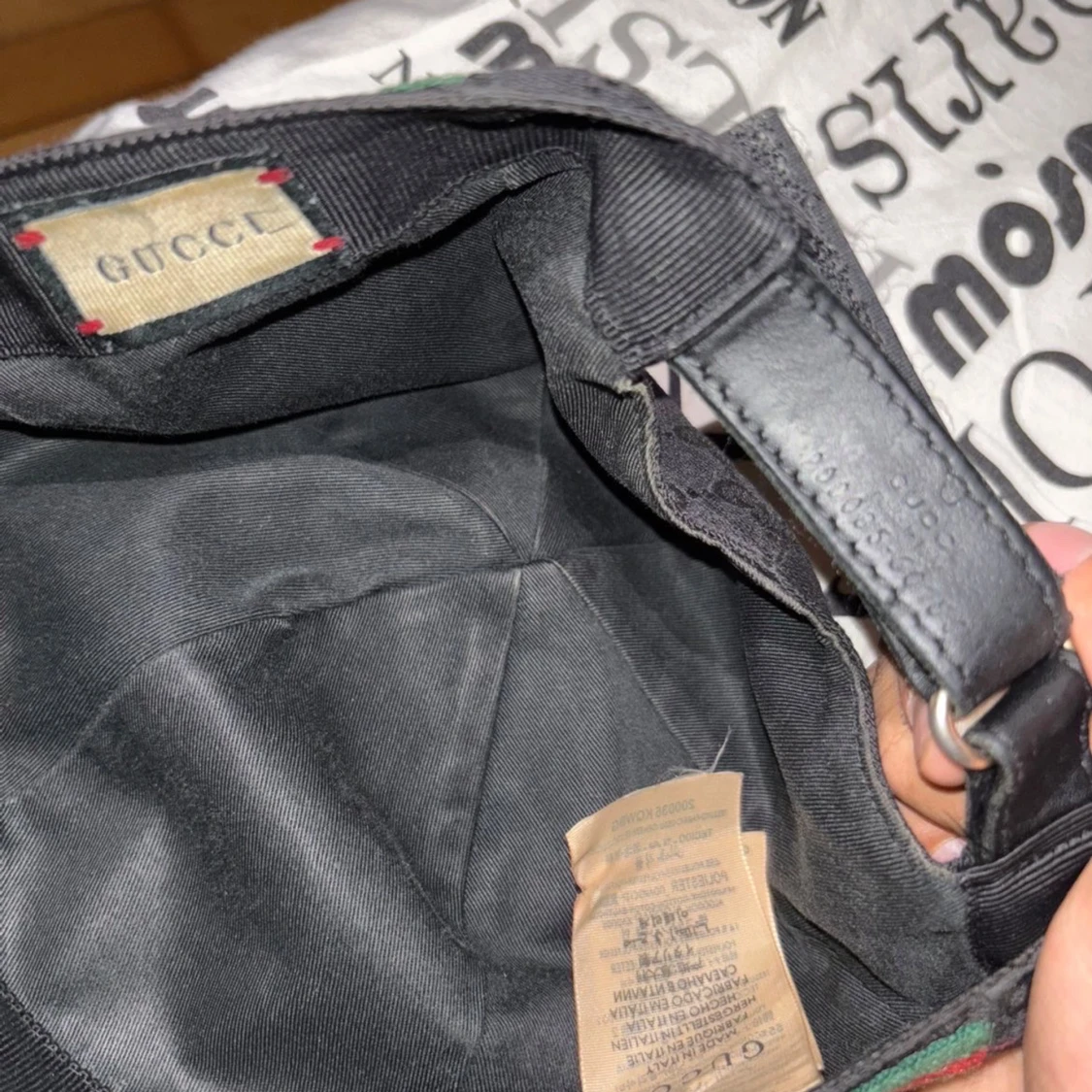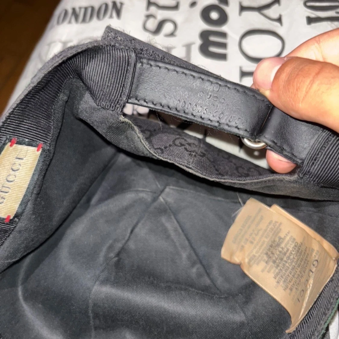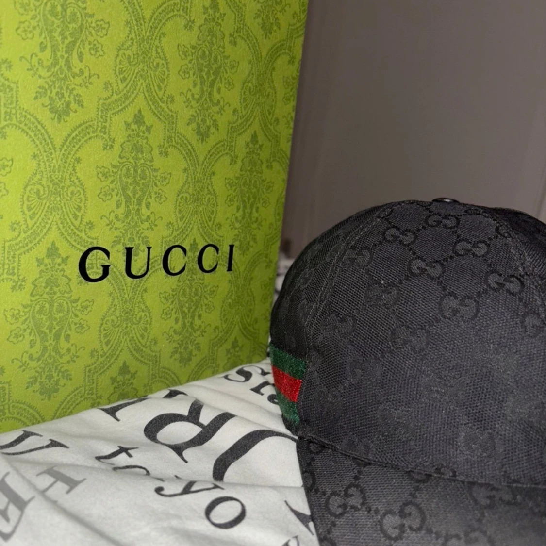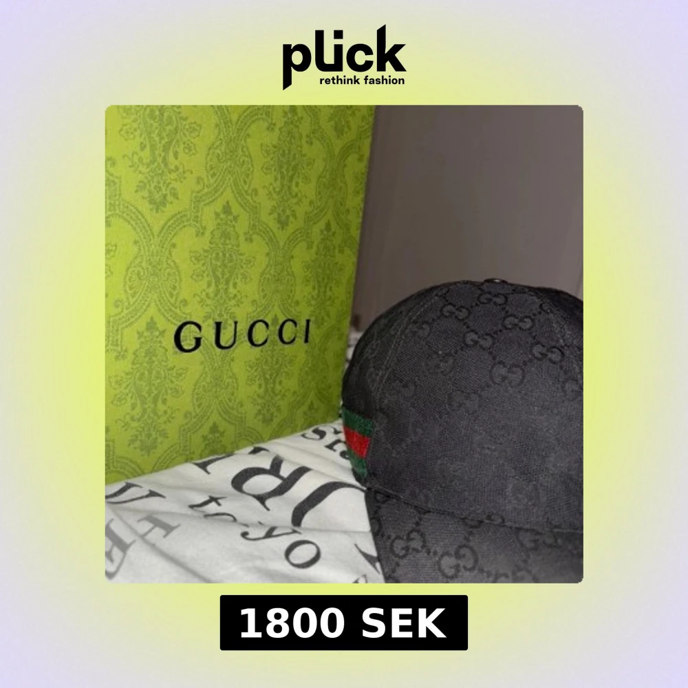 Säljer en svart keps från Gucci med klassiskt GG-monogram över hela kepsen. Kepsen har gröna och röda ränder på sidan och justerbart spänne bak i svart läder. Materialet är polyester och bomull, insidan har en Gucci-etikett. Perfekt för dig som gillar exklusiva accessoarer.