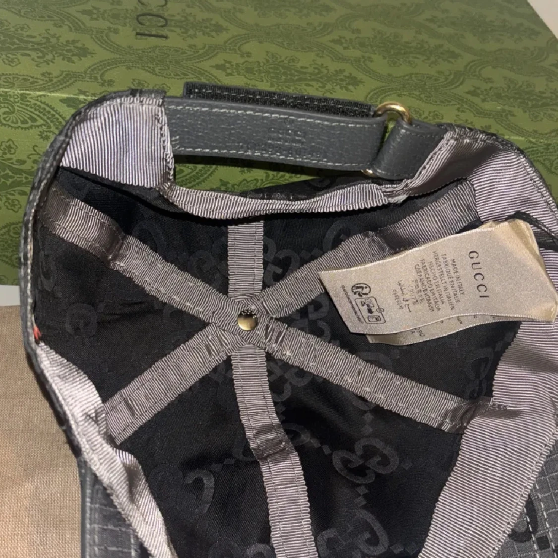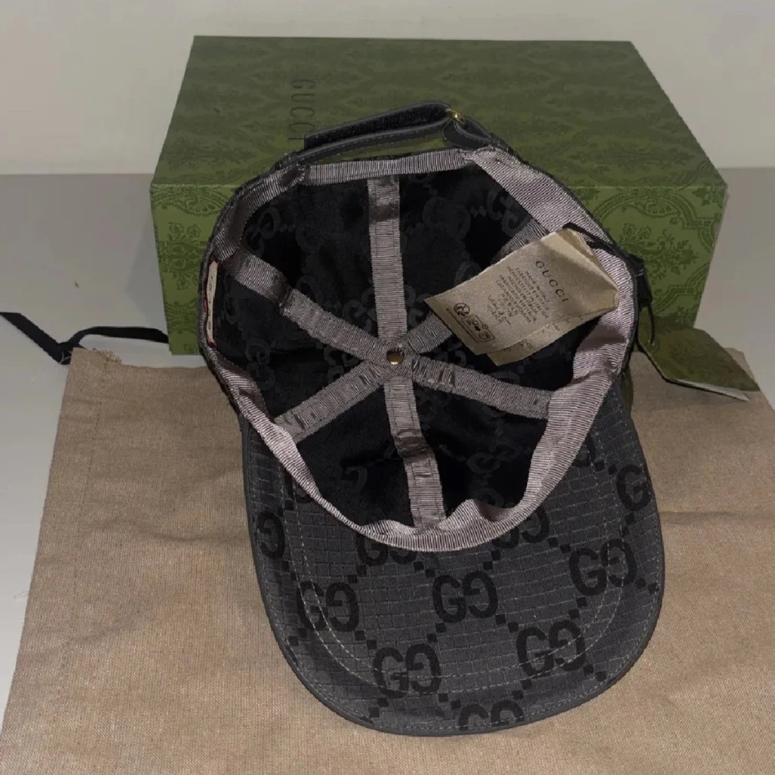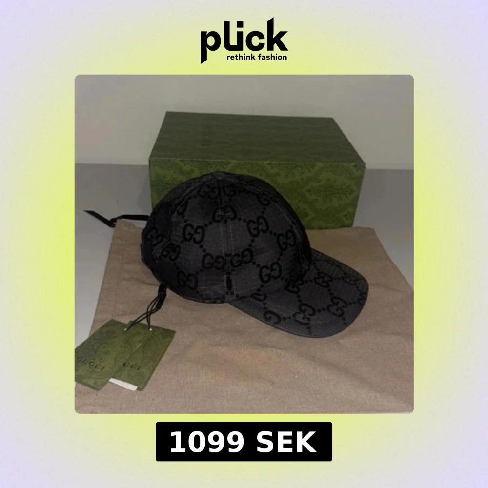 Snygg svart keps från Gucci med klassiskt GG-mönster över hela kepsen. Justerbar rem baktill i skinn och detaljer i guld. Kepsen är i bomullsmaterial och har märkets logga på etiketten.