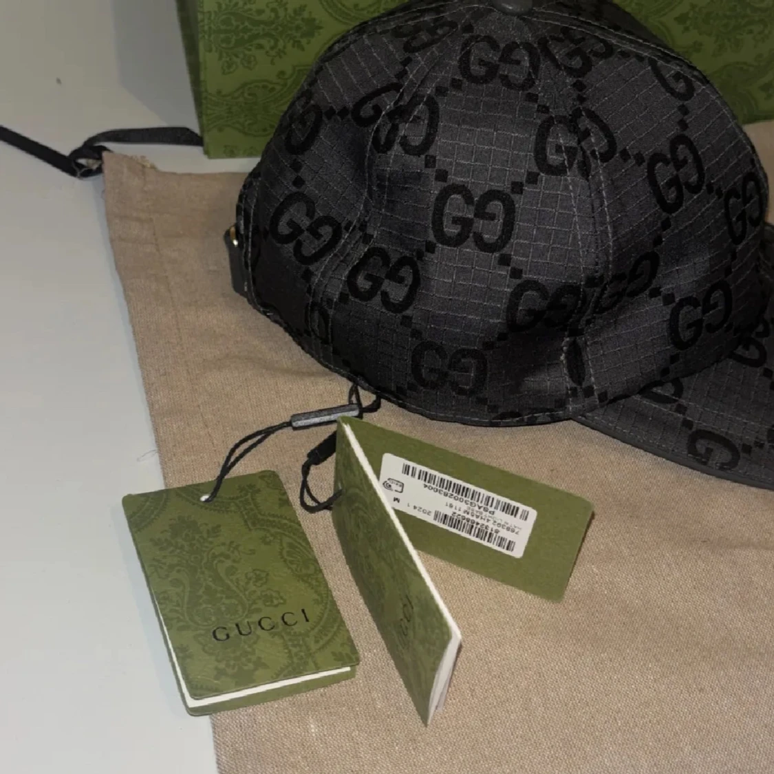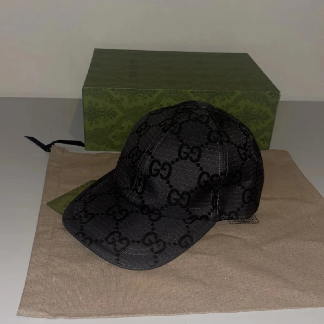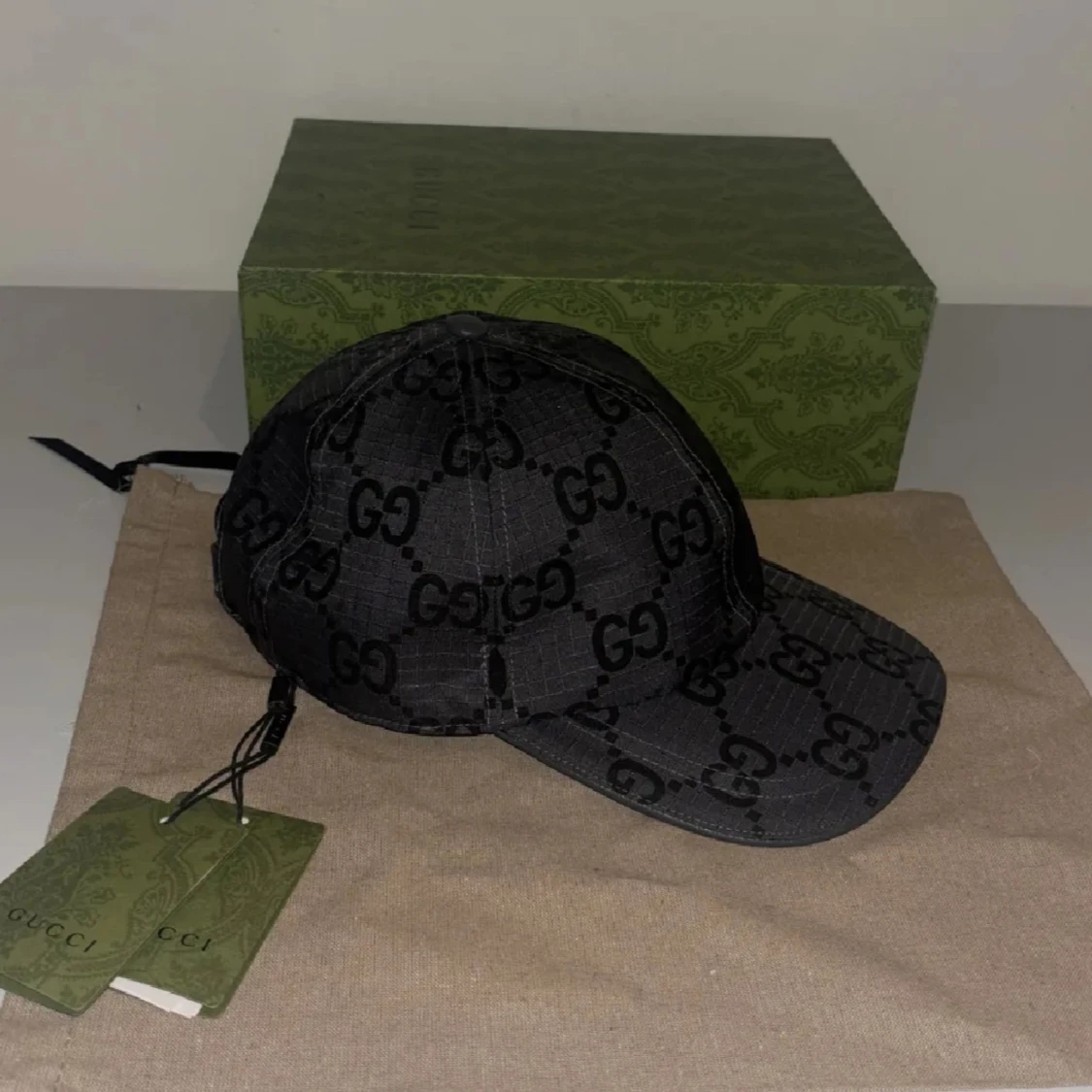 Snygg svart keps från Gucci med klassiskt GG-mönster över hela kepsen. Justerbar rem baktill i skinn och detaljer i guld. Kepsen är i bomullsmaterial och har märkets logga på etiketten.