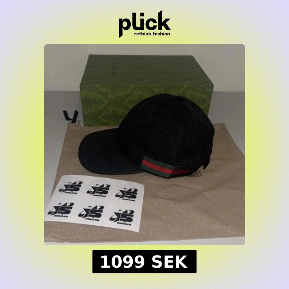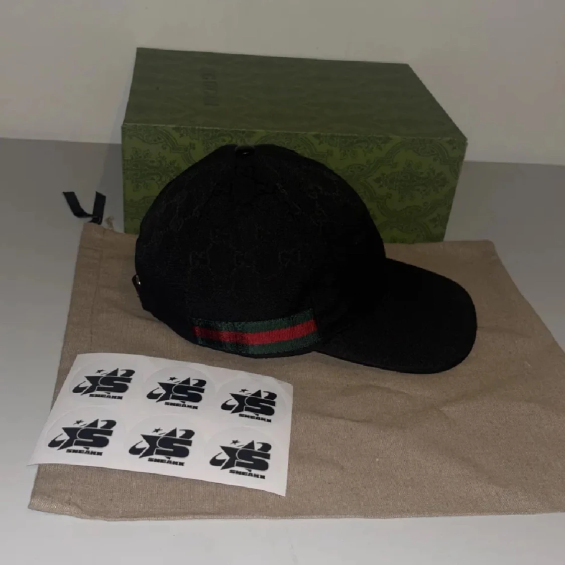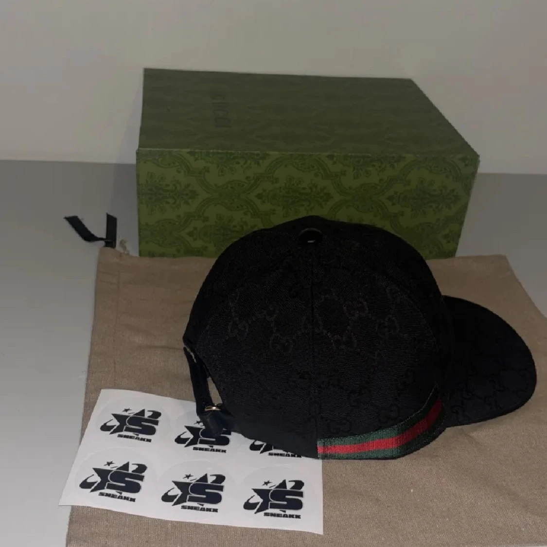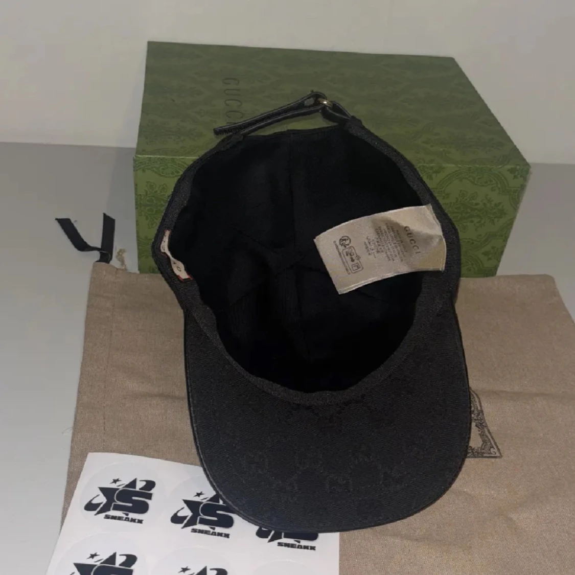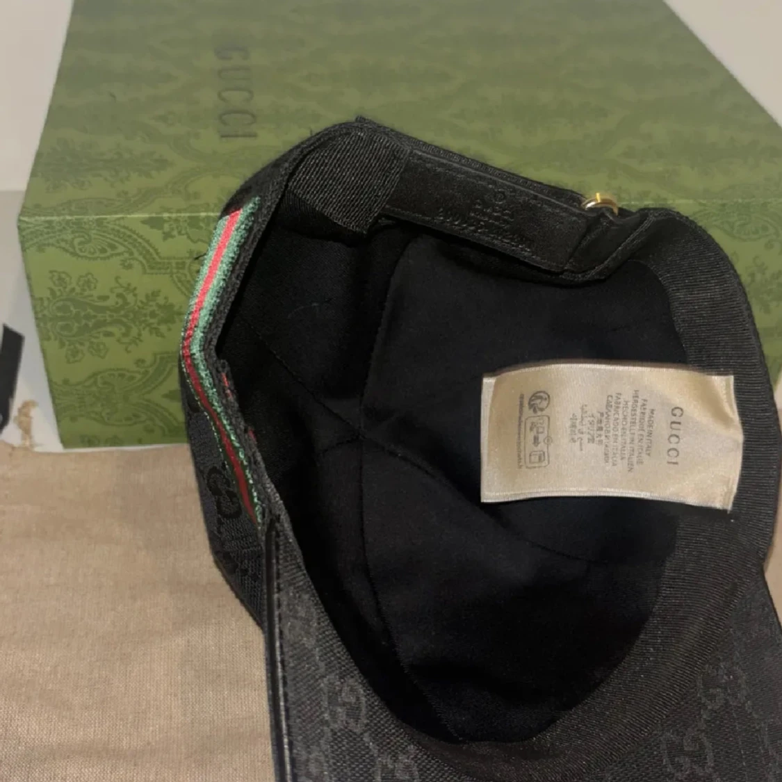 Snygg svart keps från Gucci med diskret GG-mönster och klassisk grön-röd rand på sidan. Kepsen har böjd skärm och justerbar rem baktill. Perfekt accessoar för en trendig look. Finns i S M L