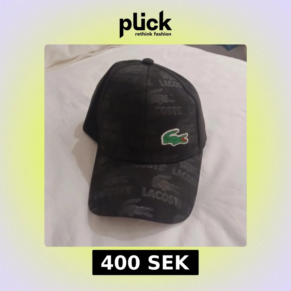 Snygg svart keps från Lacoste med broderad grön krokodil på framsidan. Kepsen har justerbart spänne i metall baktill och märkeslogga både inuti och utanpå. Perfekt för en stilren look. Perfekt för en golfare eller något liknande. Fick den i present vet ej ifall den är äkta