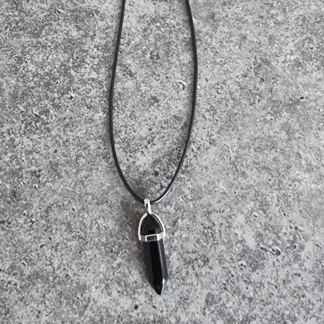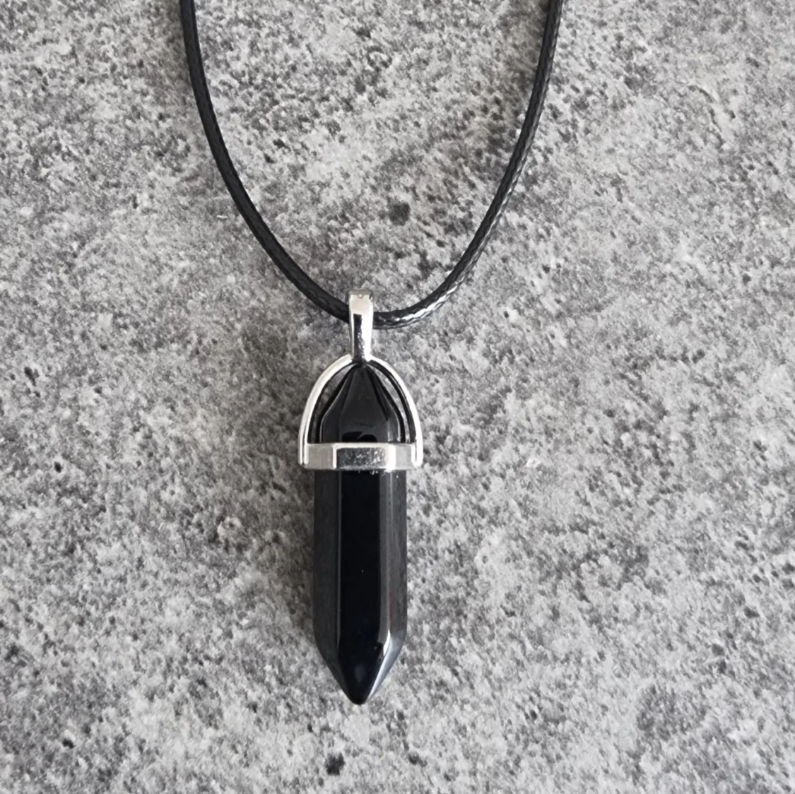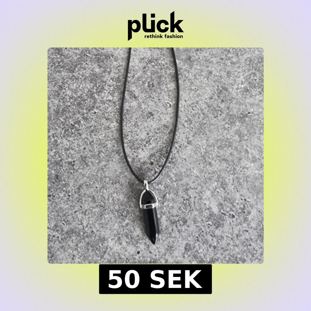 Hänge med halsband i läder liknande material samt liten kedjedel. Smyckes storlek: ca 41mm x 13mm Kedjestorlek: ca 45cm - 50cm Observera att ditt smycke kan skilja sig något från bilderna på grund av naturliga material.🎈Fri frakt❤️