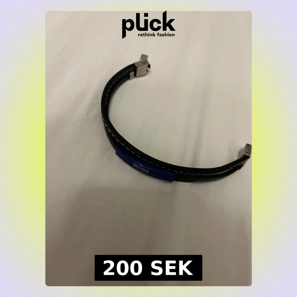Stilrent svart armband i läder från BOSS med blå metallplatta där loggan står i vitt. Armbandet har vita sömmar längs kanterna och ett robust spänne i silverfärgad metall. Perfekt accessoar för en clean och modern look.