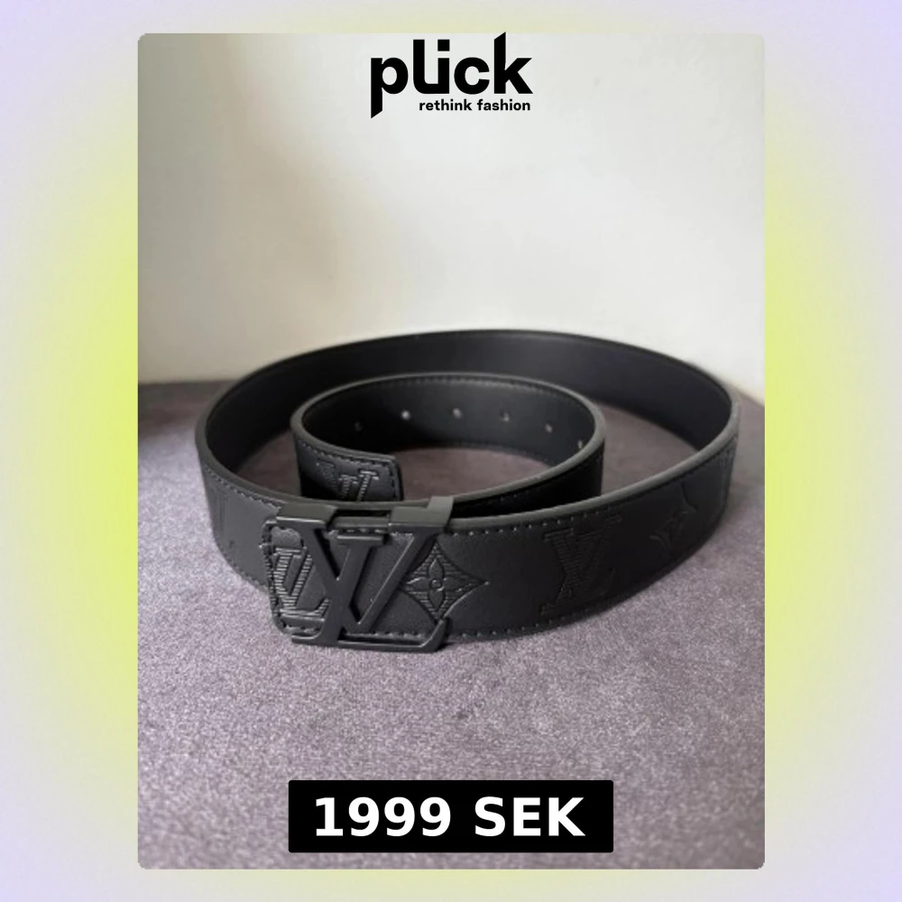 Snyggt svart Louis Vuitton bälte i skinn med präglade LV-loggor och monogram längs hela remmen. Bältet har en stilren, matt svart LV-spänne och bred design som ger en lyxig vibe. Perfekt för dig som vill ha en statement-accessoar med exklusiv känsla.