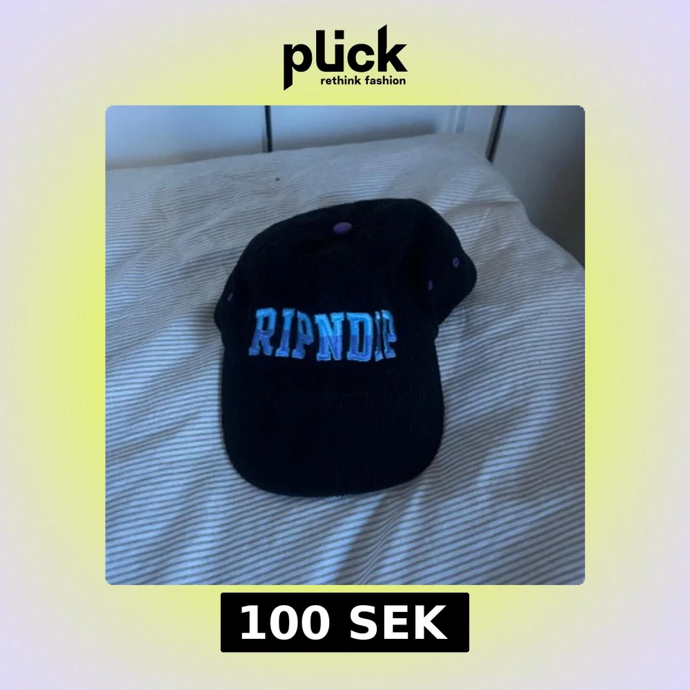 Snygg svart keps i manchester från Ripndip med broderad text i blått och lila framtill. På sidan finns en broderad katt. Perfekt för en cool och avslappnad stil.