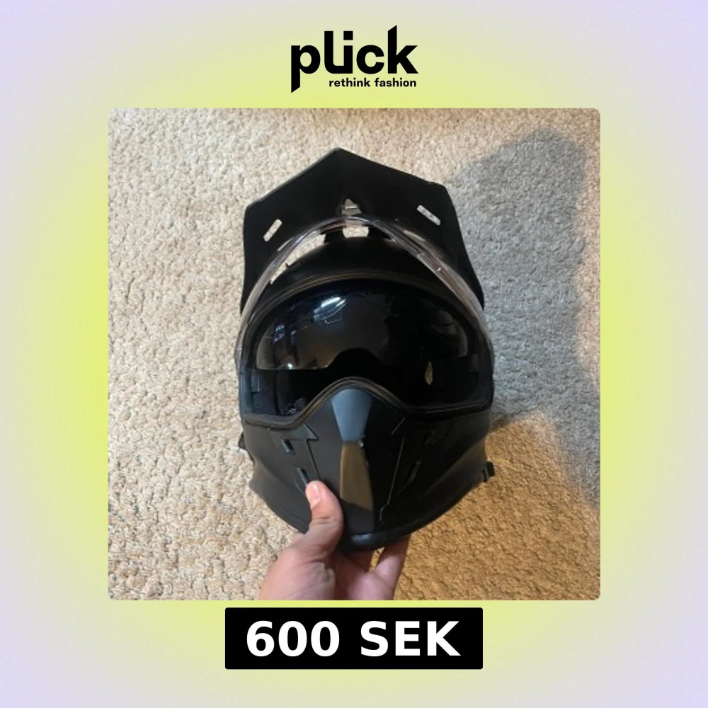 Säljer en svart motorcykelhjälm från ProtectWear med visir och integrerat solskydd. Hjälmen har sportig design, ventilation och tydlig märkning ECE-R 22.05. Passar huvudomfång 57-58 cm.
