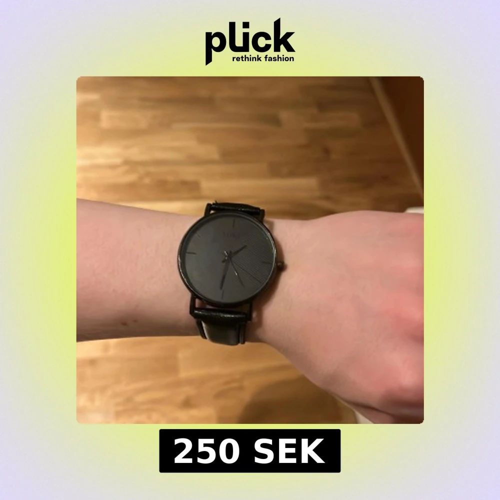 Stilren svart klocka med svart urtavla och svarta visare. Klockan har ett enkelt, modernt utseende och svart läderarmband med slät finish. Perfekt för dig som gillar en clean look och diskreta accessoarer.