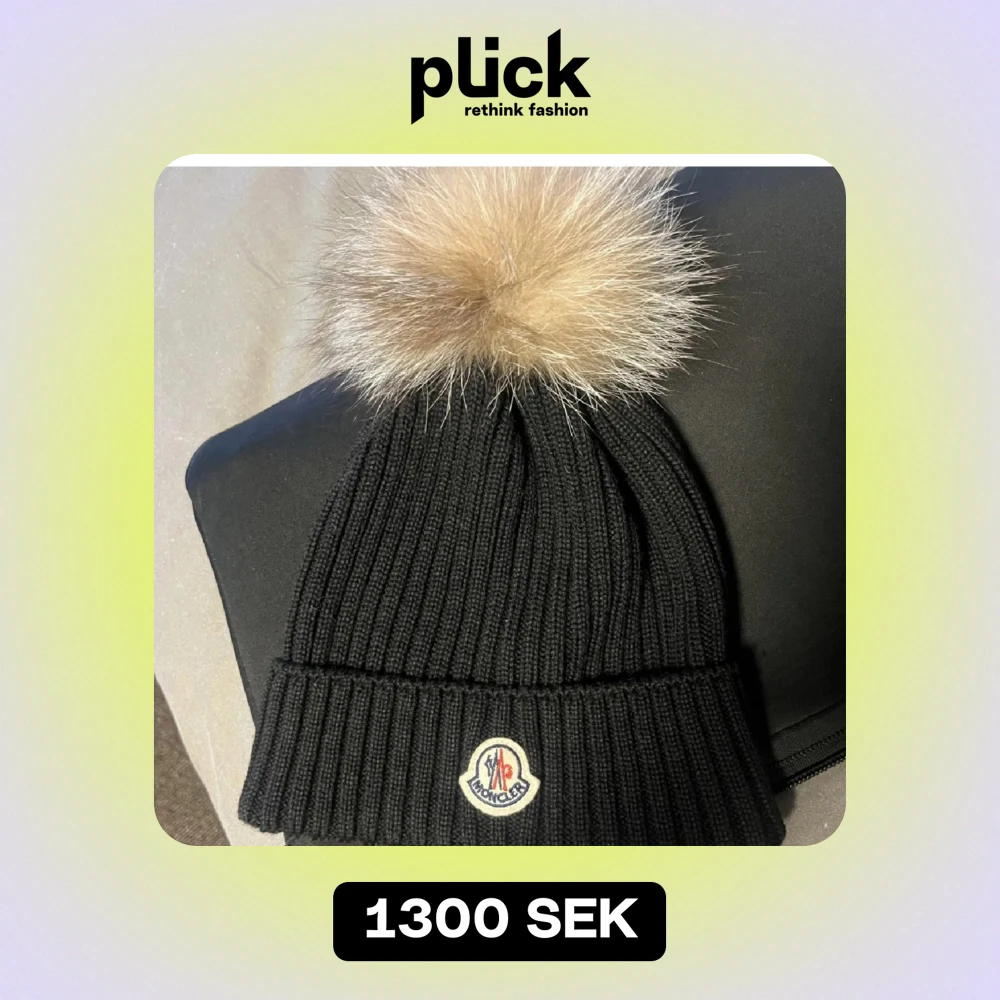Säljer en snygg svart ribbad mössa från Moncler med en fluffig beige pälsboll på toppen. Den är i mycket bra skick och passar de flesta tack vare sin stretchiga passform. INGET KVITTO FINNS, det är present som inte kommer till användning. I storlek L (barnstorlek dock passar vuxna också!)