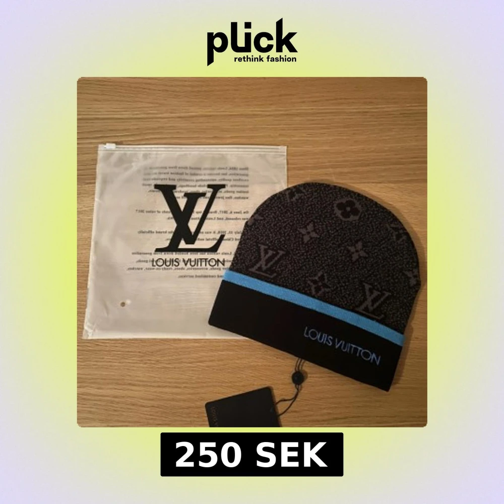Svart mössa med klassiskt monogrammönster och blå kant. Märkets logga är broderad framtill i blått. Snygg och lyxig design som sticker ut, perfekt för dig som gillar exklusiva accessoarer.