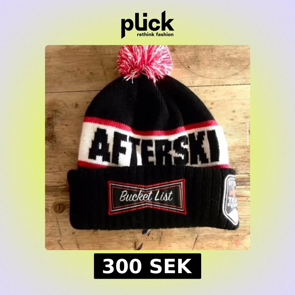 Snygg svart mössa med texten 'Afterski' i vitt och rött. Mössan har en stor röd och vit tofs på toppen och en uppvikt kant med texten 'Bucket List'. Perfekt för kalla dagar i backen! Har aldrig använt mössan och den finns ej att köpa på internet så passa på!(frakt betalas själv)