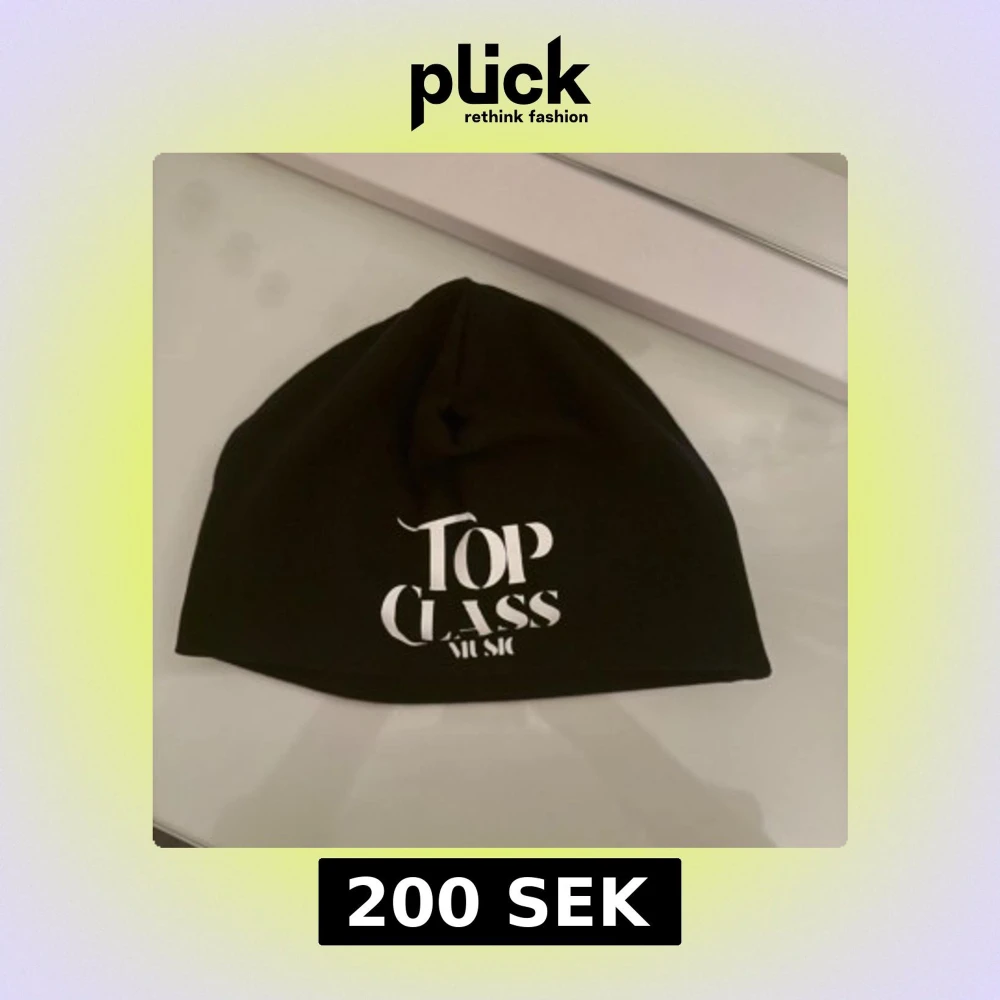 Svart mössa med vit tryckt text 'Top Class Music' framtill. Enkel och stilren design, perfekt för dig som vill ha en clean look. Tillverkad i mjukt material som sitter skönt på huvudet.