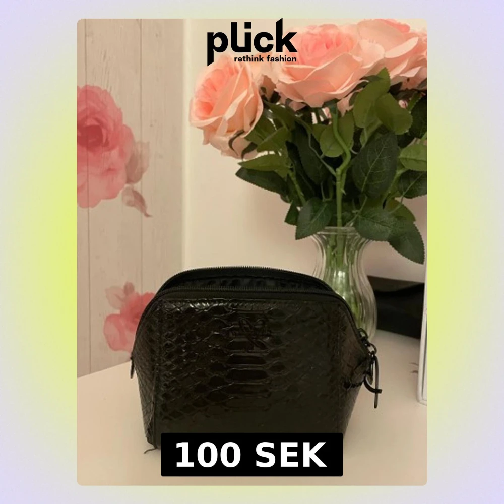 Snygg svart necessär från Victoria's Secret med glansig, ormskinnsmönstrad yta och hjärtformad dragkedja. Insidan är fodrad med svart- och grårandigt tyg och har en innerficka. Perfekt för smink eller småprylar när du är på språng.