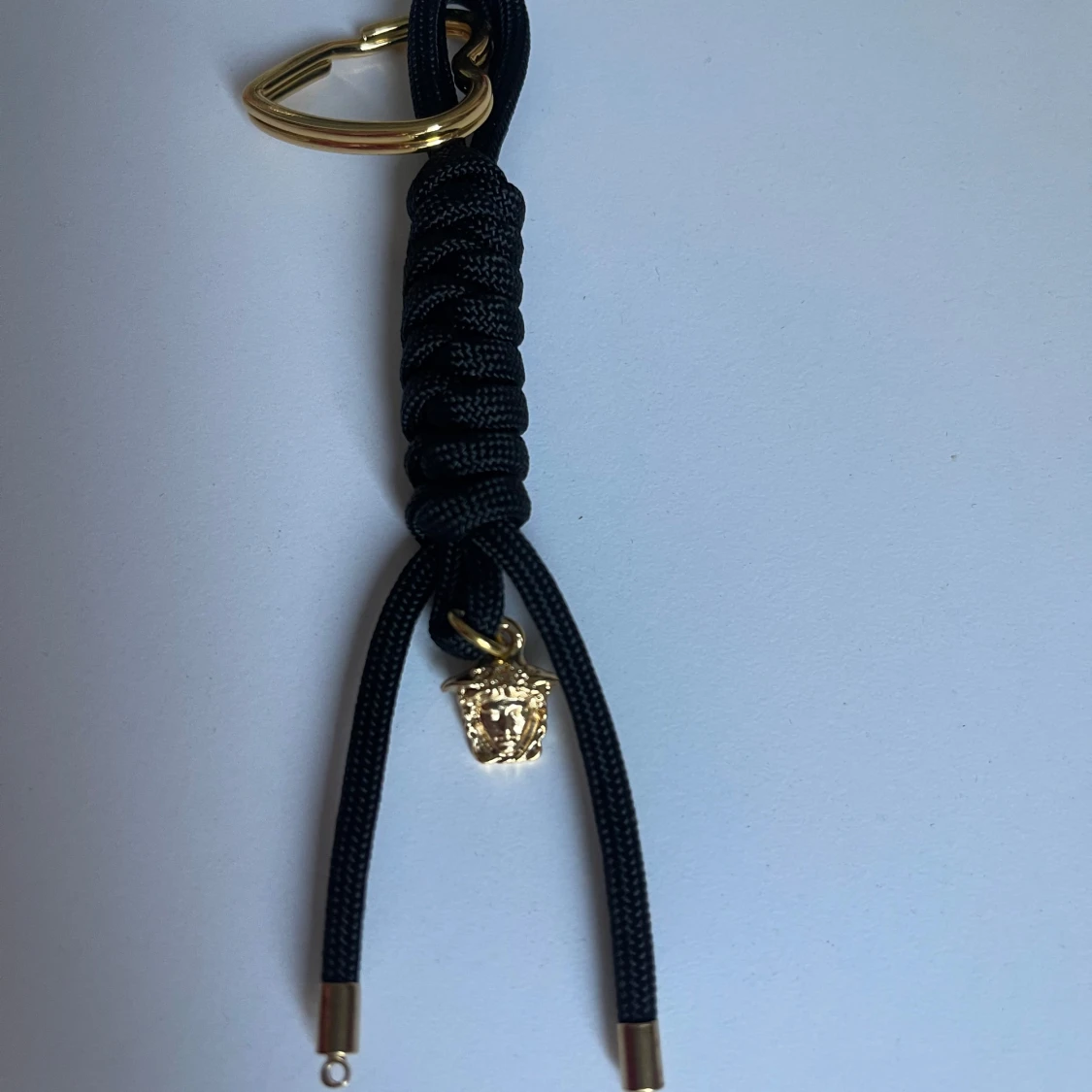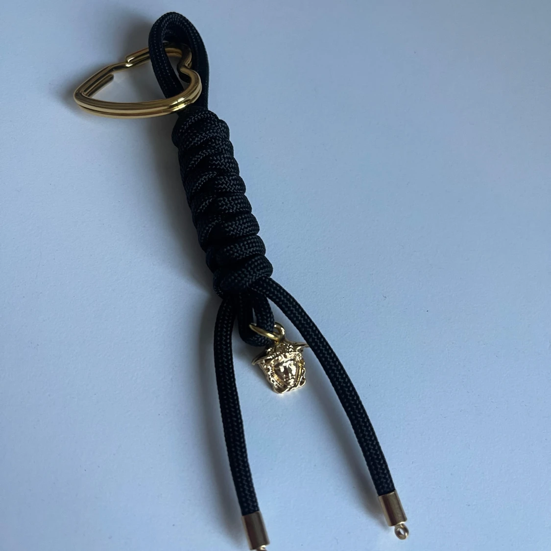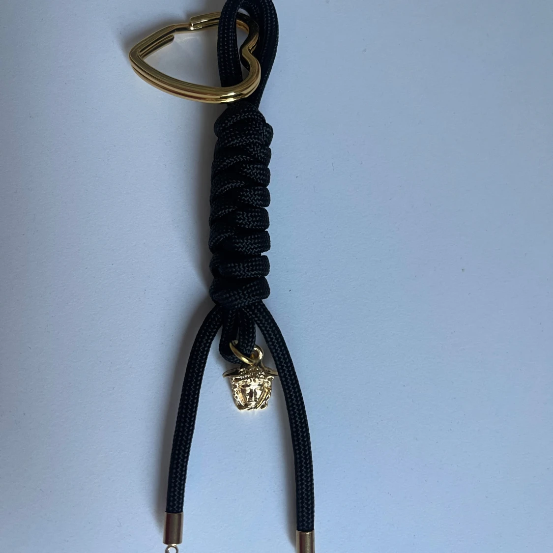 Cool svart nyckelring från flätad nylon och guldfärgade detaljer. Hjärtaformat spänne i metall och ikonisk Medusa-berlock i guld. Perfekt accessoar för att ge din väska eller nycklar en lyxig touch.