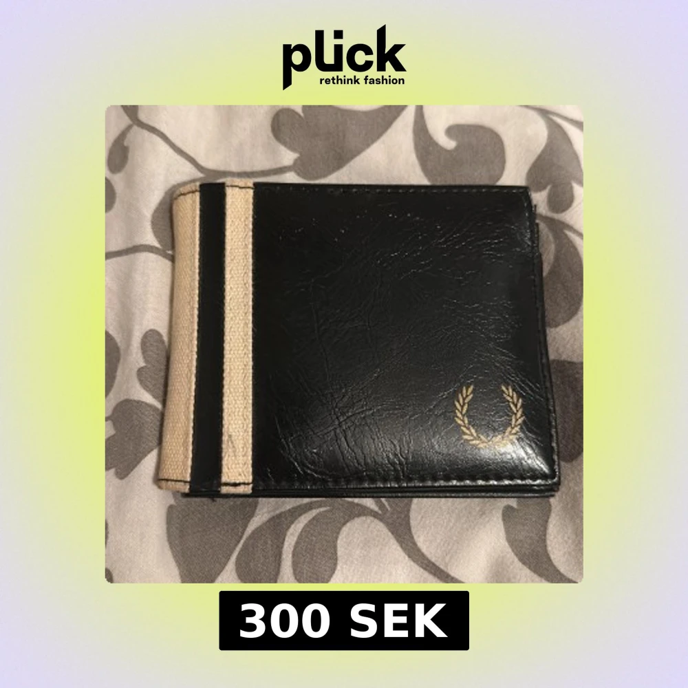 Säljer en stilren svart plånbok från Fred Perry med beige tygdetalj på sidan och klassisk lagerkrans-logga i guld. Plånboken har flera kortfack och ett fack med plastfönster för legitimation. Perfekt för dig som vill ha en snygg och praktisk accessoar.