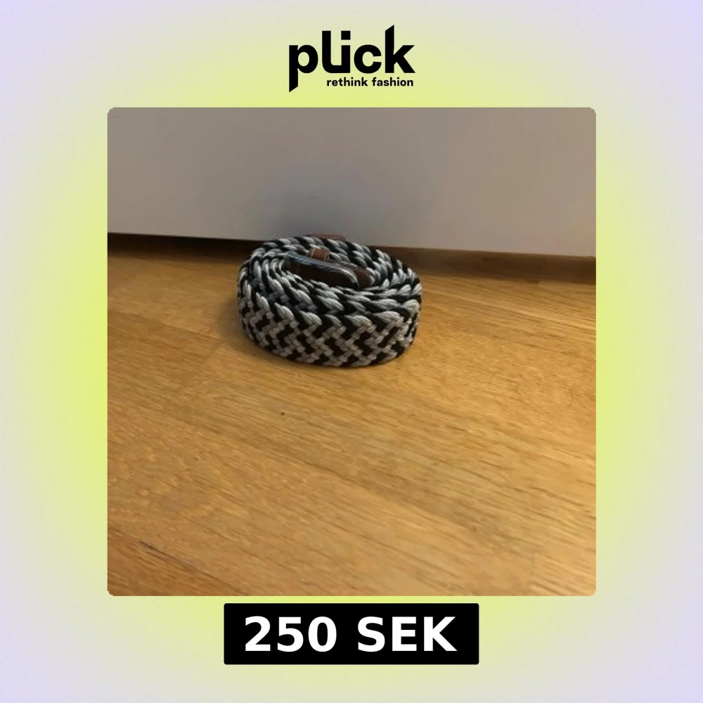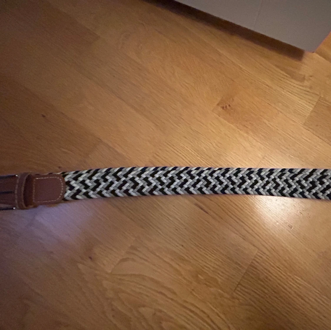 Snyggt flätat bälte i svart och grått med bruna skinn-detaljer vid spännet. Bältet har ett coolt mönster och passar perfekt till jeans. Nypris ca 350 kr