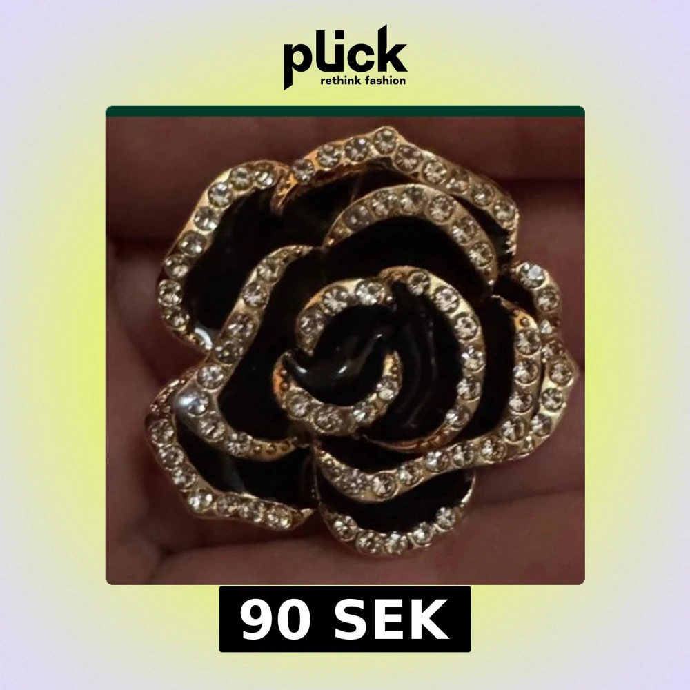 Elegant brosch i form av en ros med svart emalj och guldfärgade kanter dekorerade med glittrande strass. Perfekt för att ge en lyxig touch till din outfit.