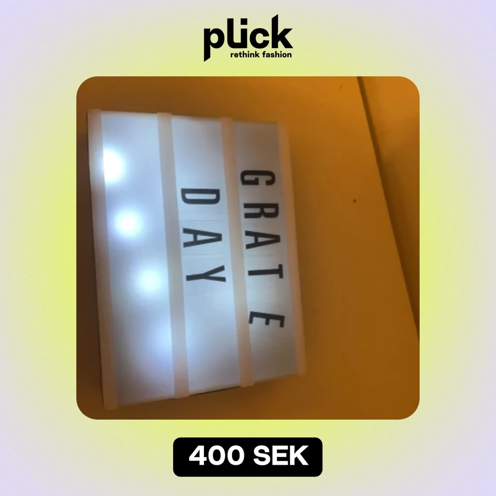Säljer en ljusskylt där du kan sätta in egna bokstäver för att skapa meddelanden. Skylten är vit med tre rader och har en svart kant. Den drivs av batterier och har en på/av-knapp på sidan. Perfekt för att skapa personliga meddelanden hemma eller på kontoret. Bokstäverna är svarta och kan enkelt bytas ut.