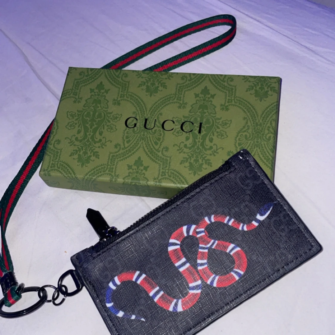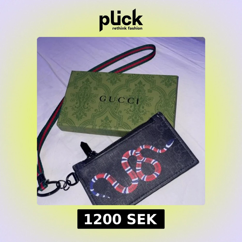 Snygg svart plånbok från Gucci med ett coolt ormtryck i rött och vitt. Plånboken har flera kortfack och en praktisk dragkedja. Den kommer med en avtagbar rem i klassiska Gucci-färger. Perfekt för att hålla ordning på dina kort och kontanter. Hör av er vid frågor