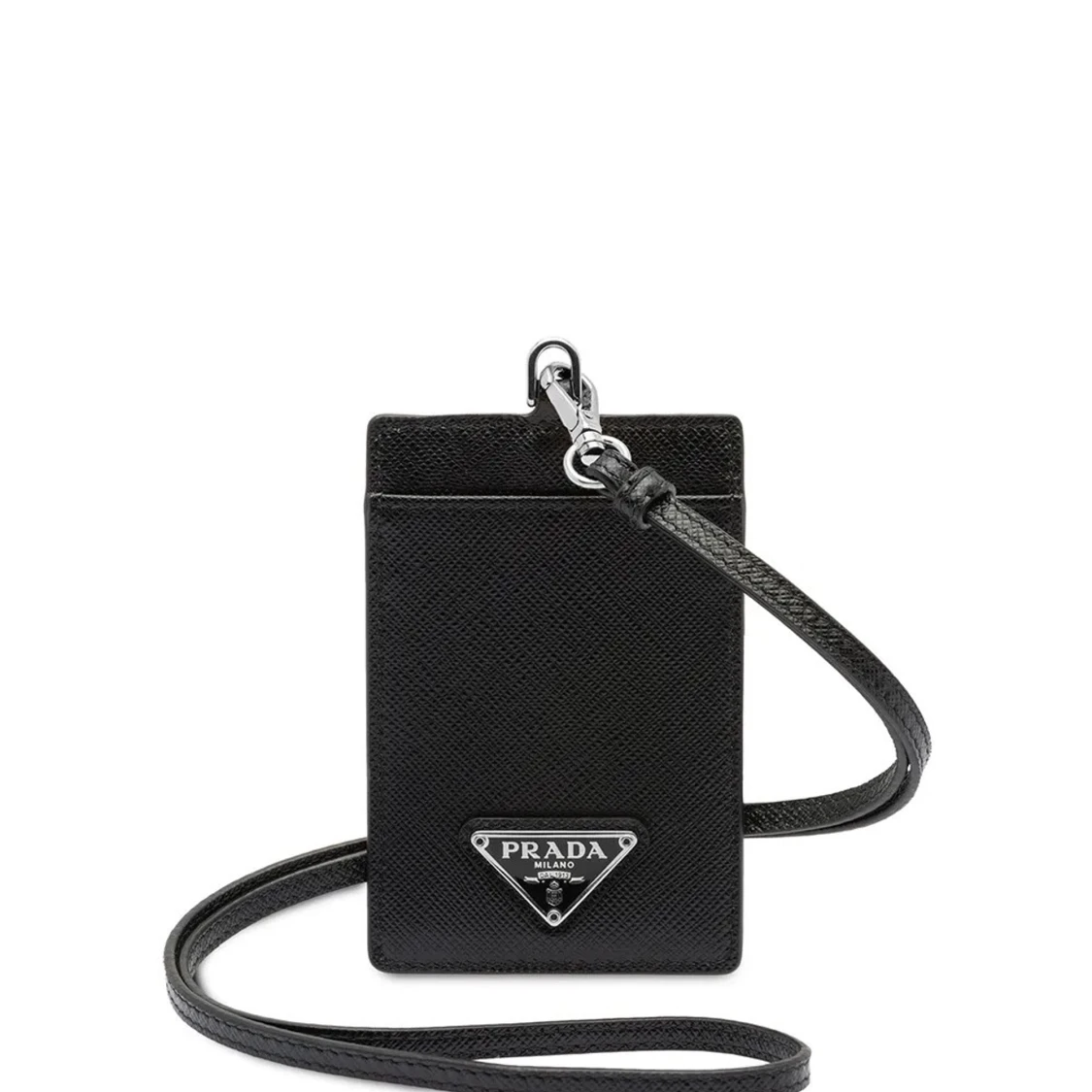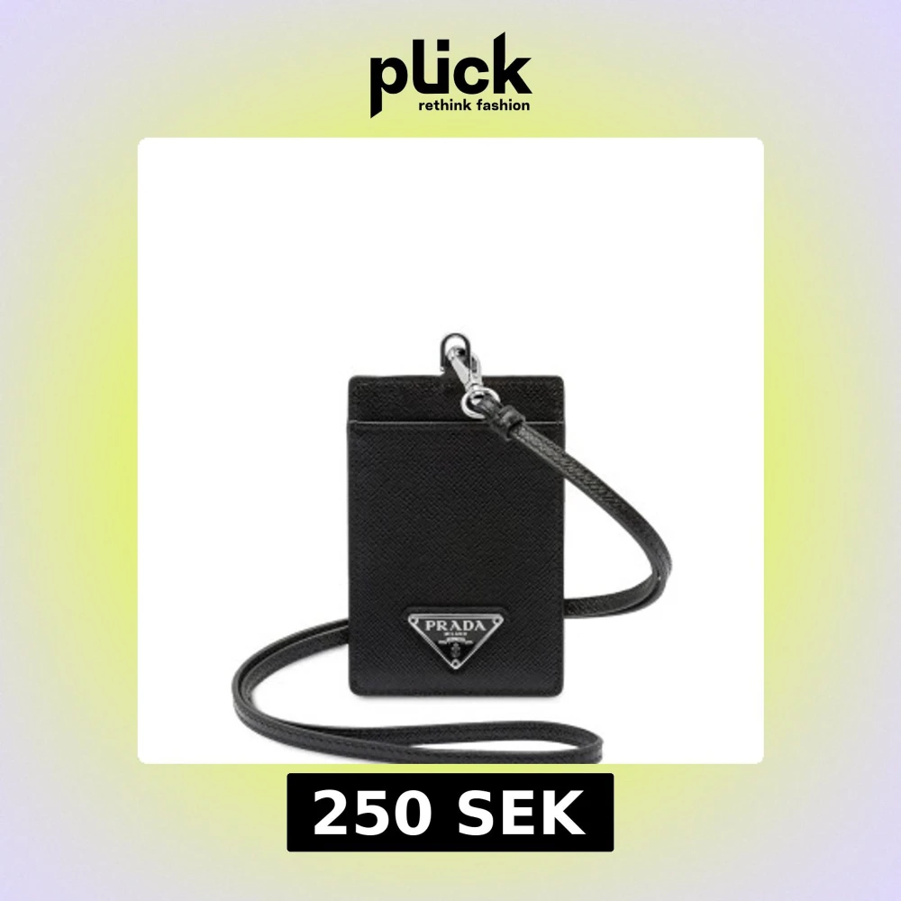 Minimalistisk svart plånbok i skinn med avtagbart axelband och ikonisk metallogo framtill. Perfekt för att bära kort och småsaker, med stilren och modern design.