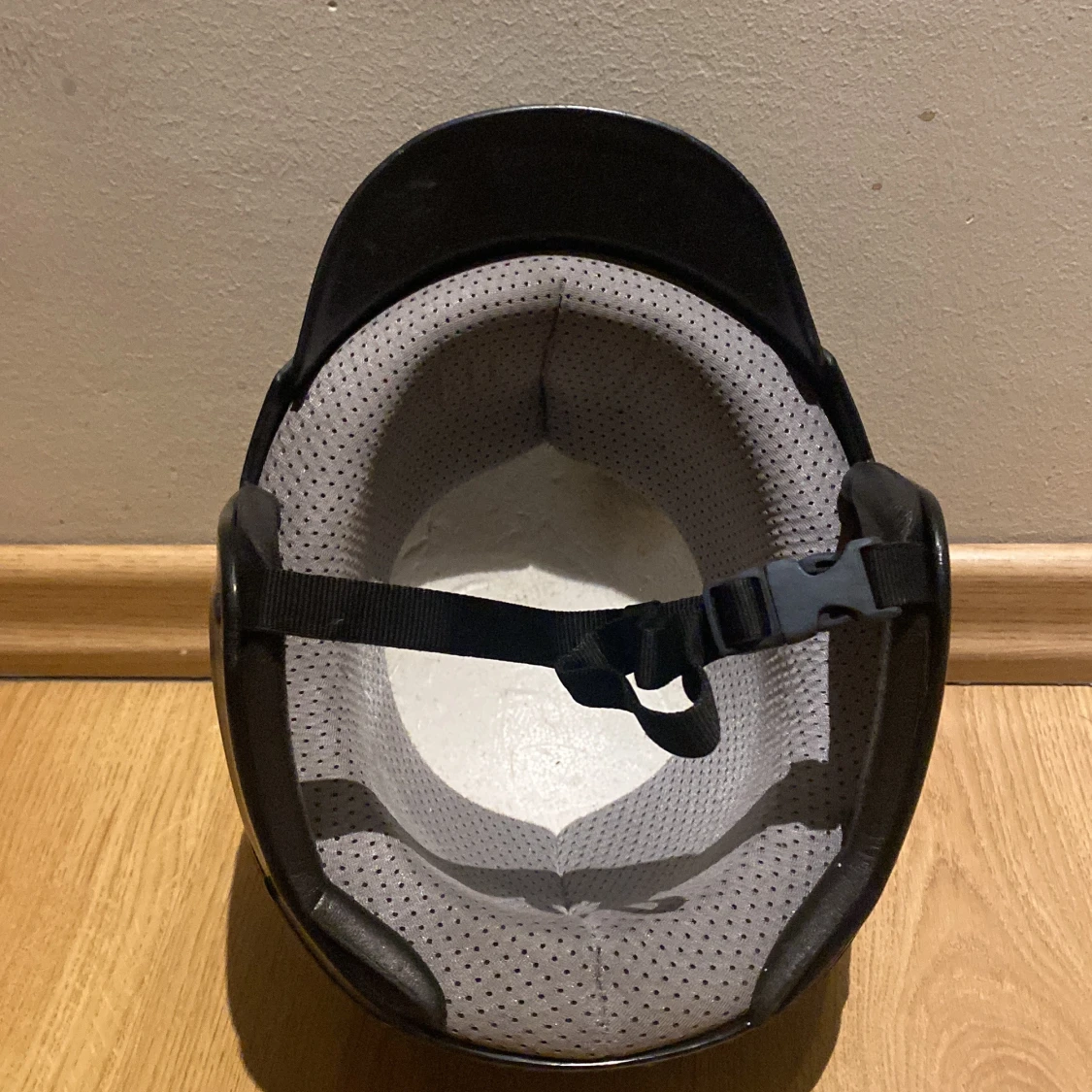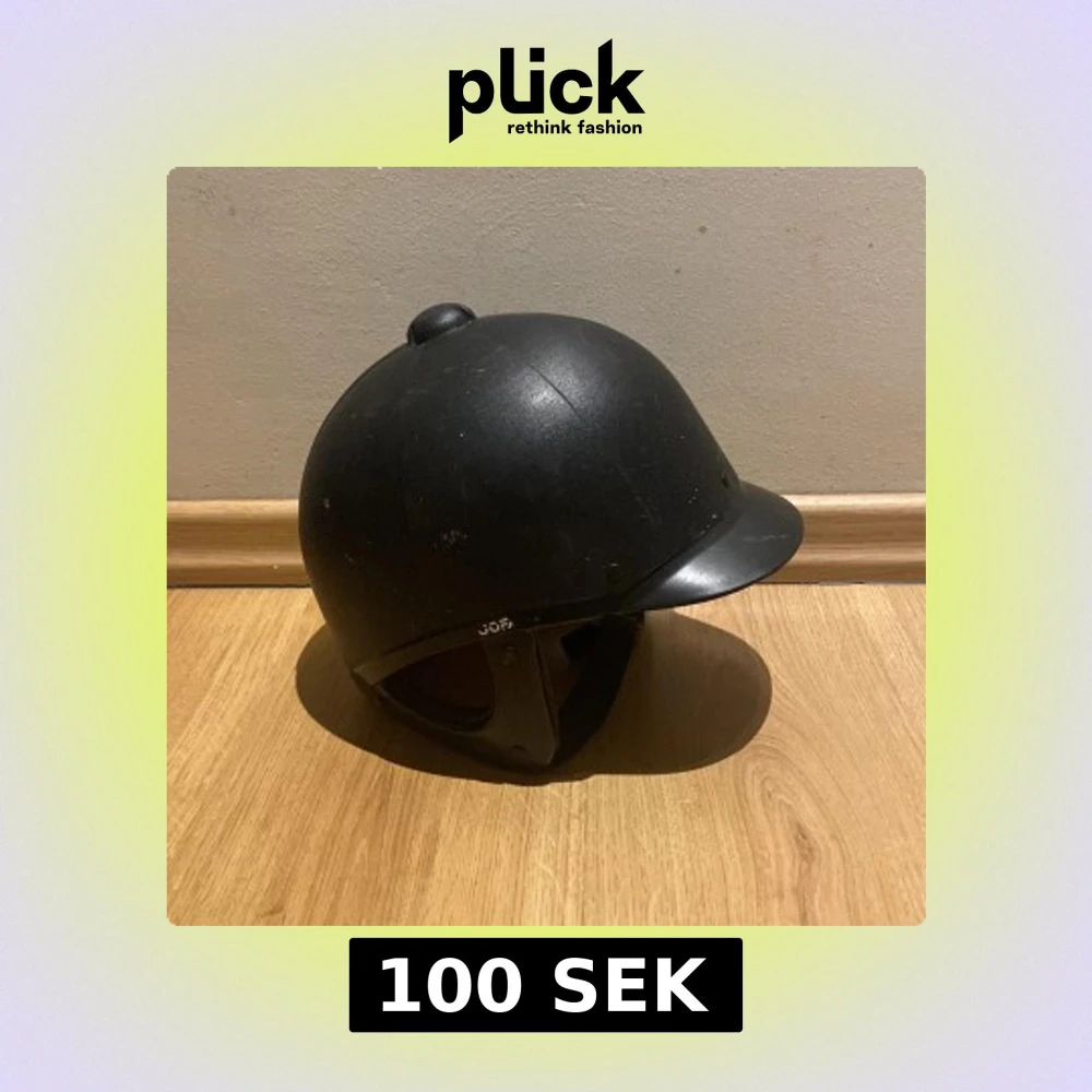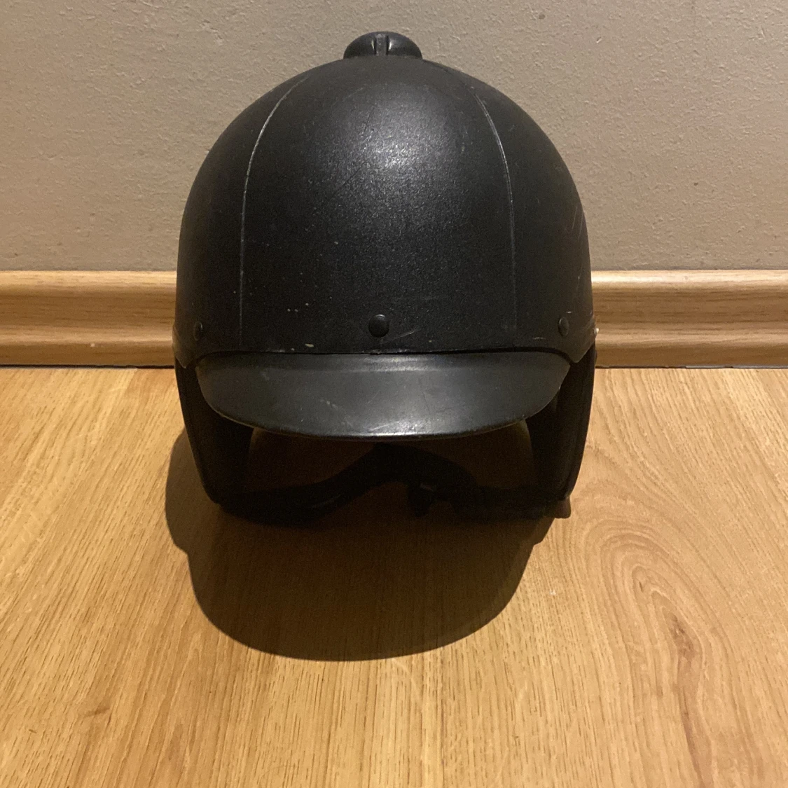 Säljer en klassisk svart ridhjälm med rundad form och kort skärm framtill. Hjälmen har justerbar hakrem och ventilerad, ljusgrå insida för extra komfort. Perfekt för dig som vill ha en stilren och säker hjälm till ridningen. Vet inte om storlek på den men ungefär för en 8-11 åring.