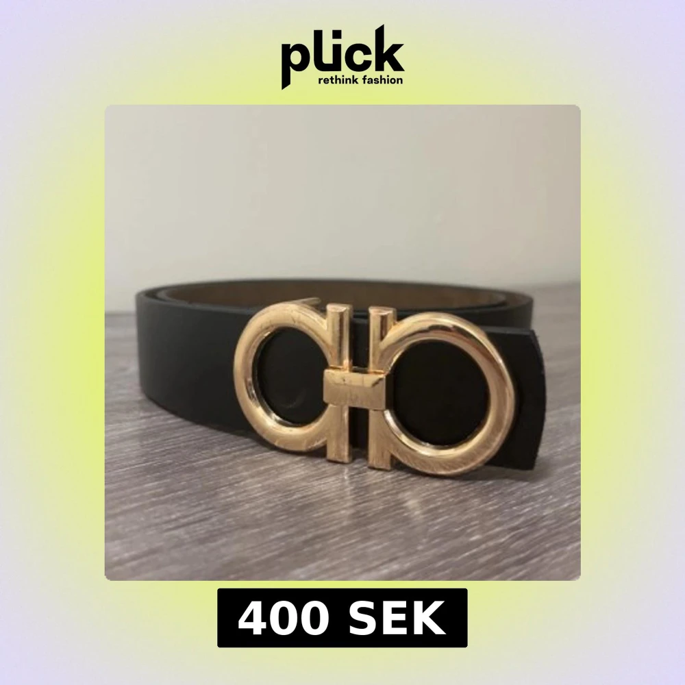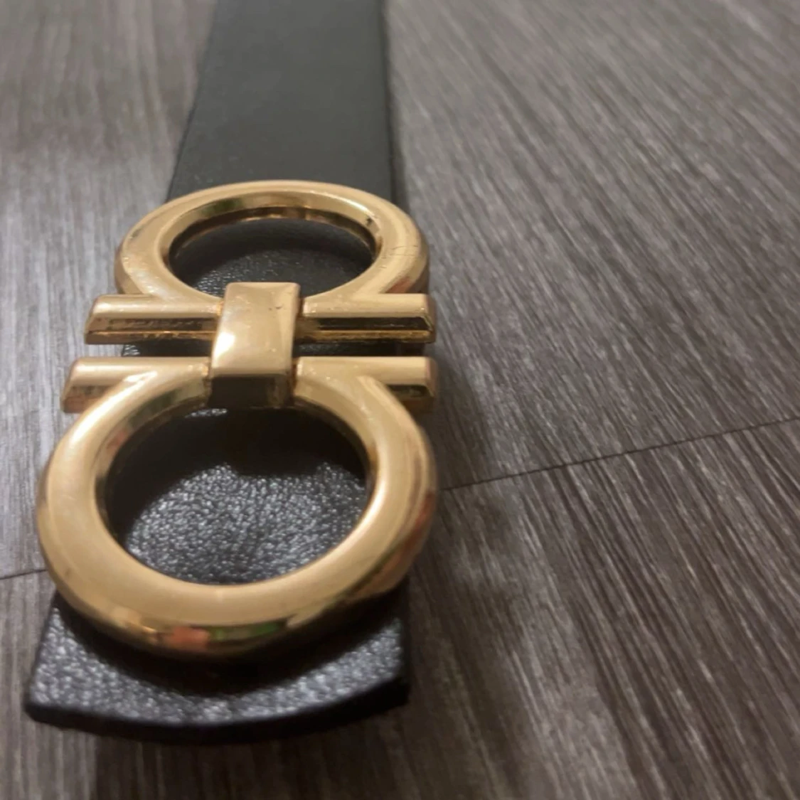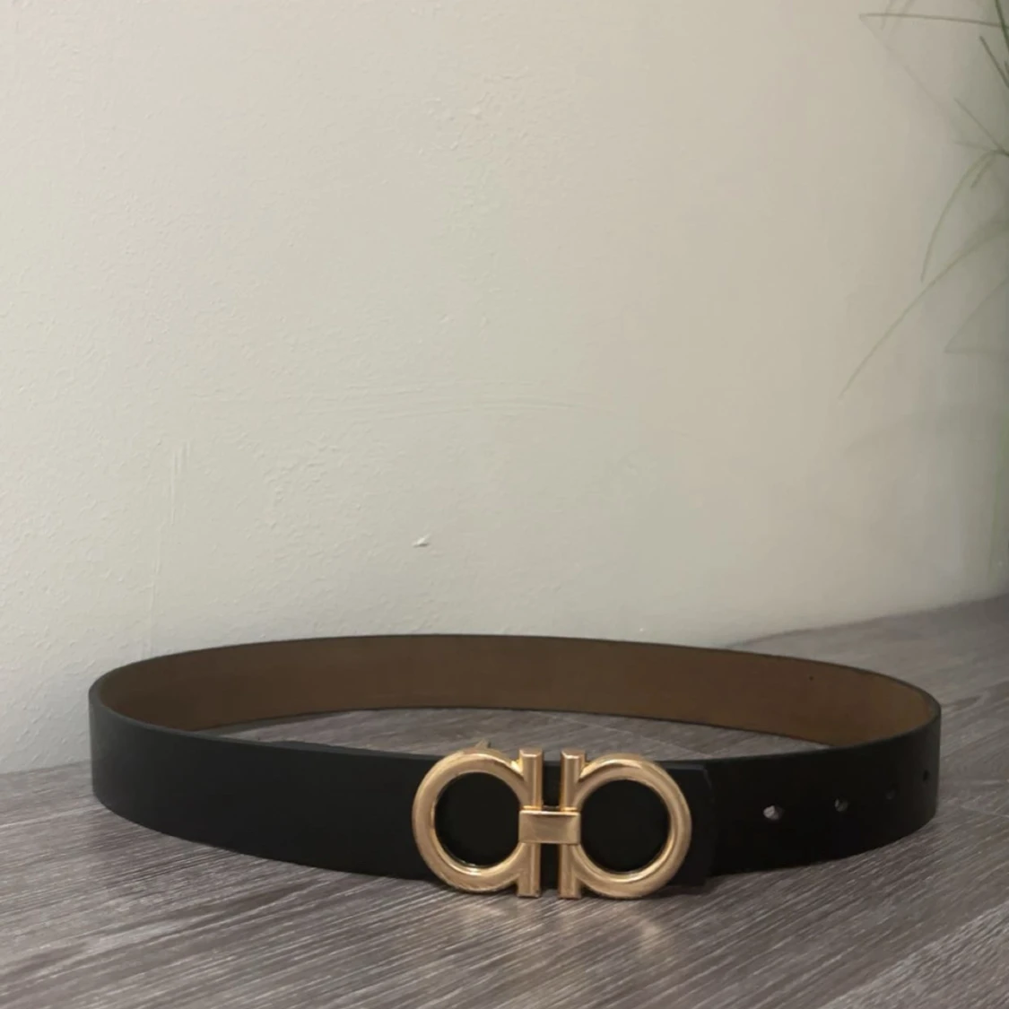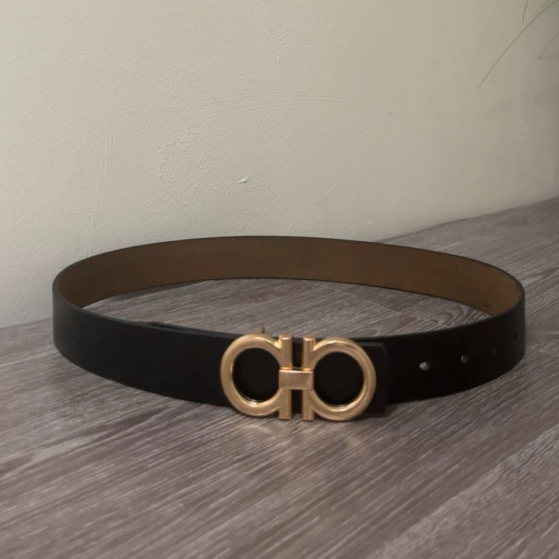 Stilrent svart bälte i skinn från Salvatore Ferragamo med ikoniskt dubbel-Gancini-spänne i guld. Bältet har en klassisk, rak form och justerbara hål för perfekt passform. Perfekt accessoar för att lyfta din outfit med en lyxig touch.