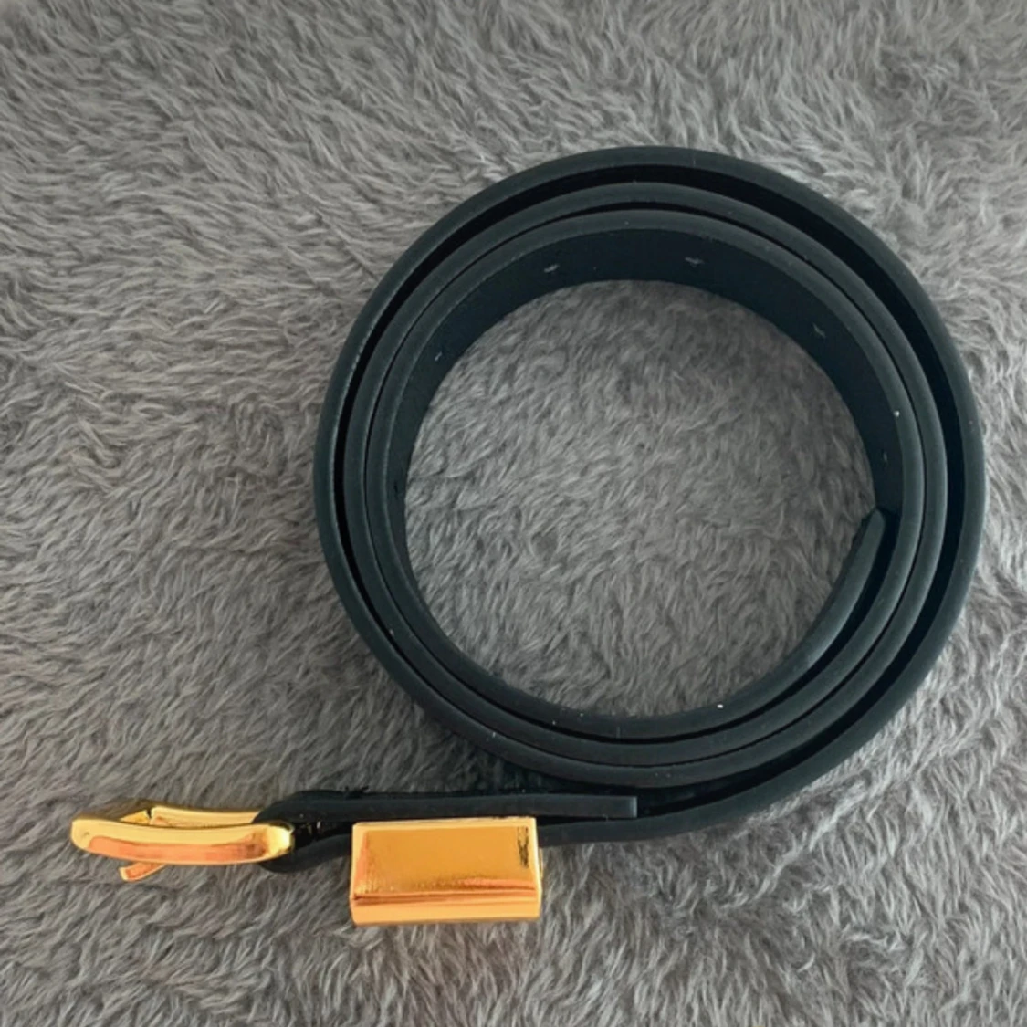 Snyggt svart bälte med exklusivt spänne i guldmetall. logga ingraverad och bältet är gjort i slätt skinn. Perfekt accessoar för att lyfta vilken outfit som helst. Tyvärr för kort för mig som är en L/xl