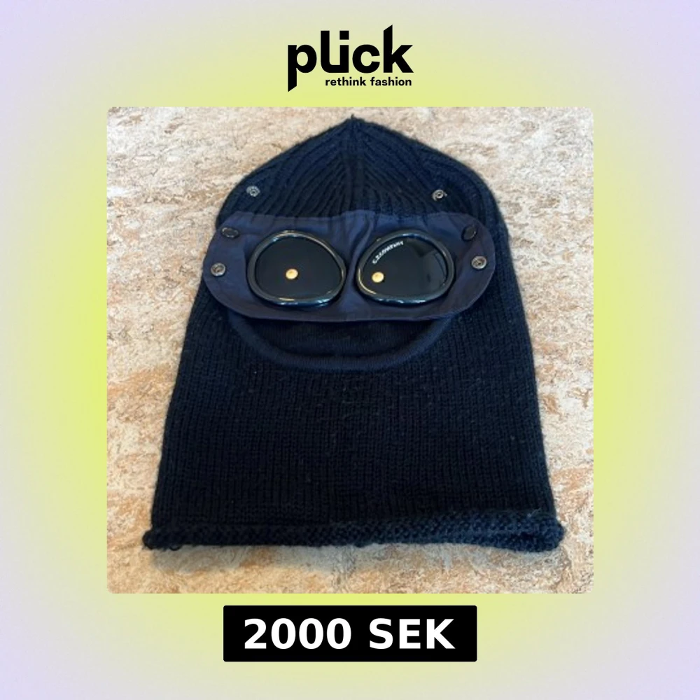 Snygg svart stickad balaclava från C.P. Company med inbyggda glasögon. Perfekt för att hålla sig varm och stilren under kalla dagar. Glasögonen är fastsatta med knappar och ger en unik look.