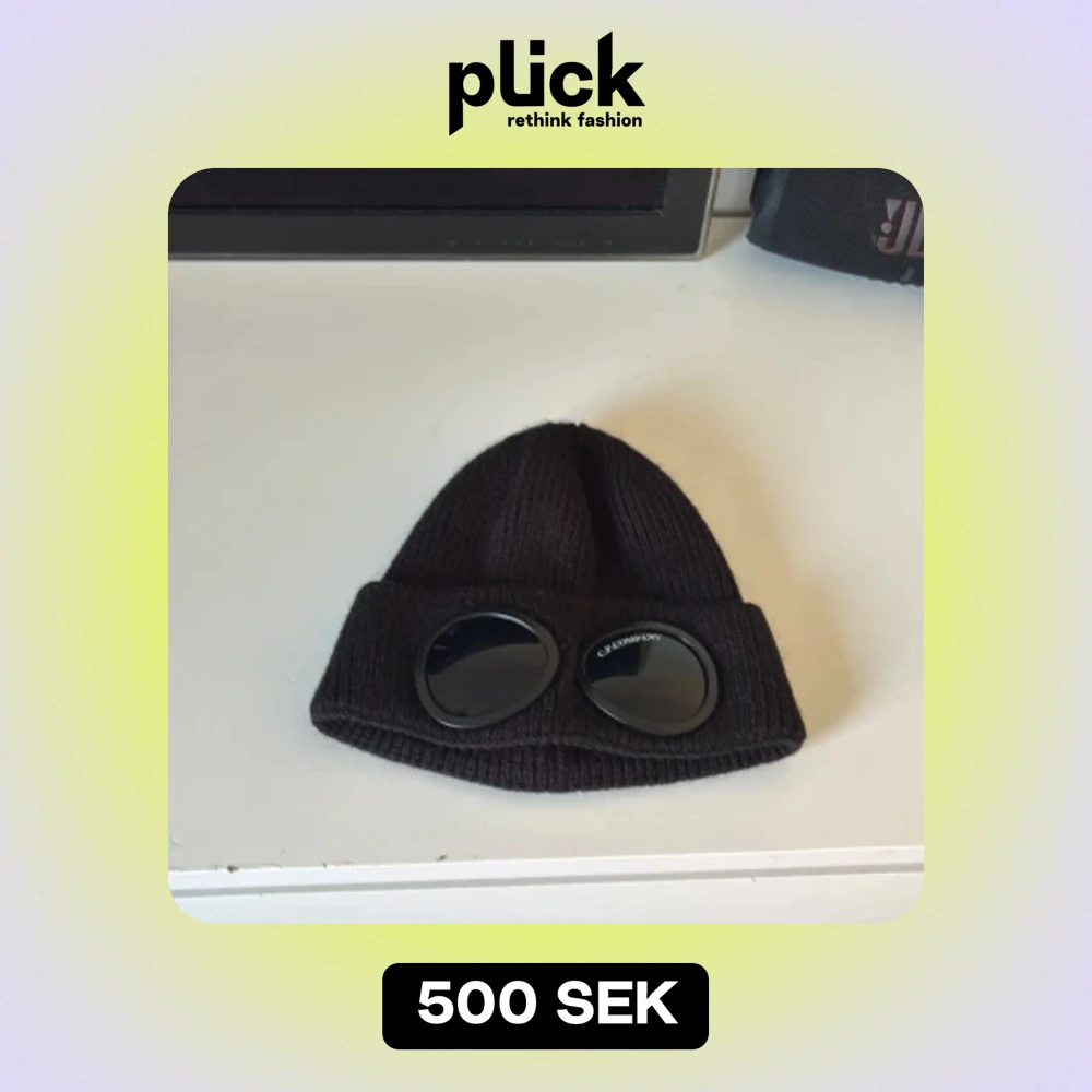 Säljer en svart stickad mössa från C.P. Company. Den har en cool design med inbyggda glasögon på framsidan, perfekt för att ge en unik touch till din outfit. Mössan är varm och bekväm, idealisk för kyliga dagar.