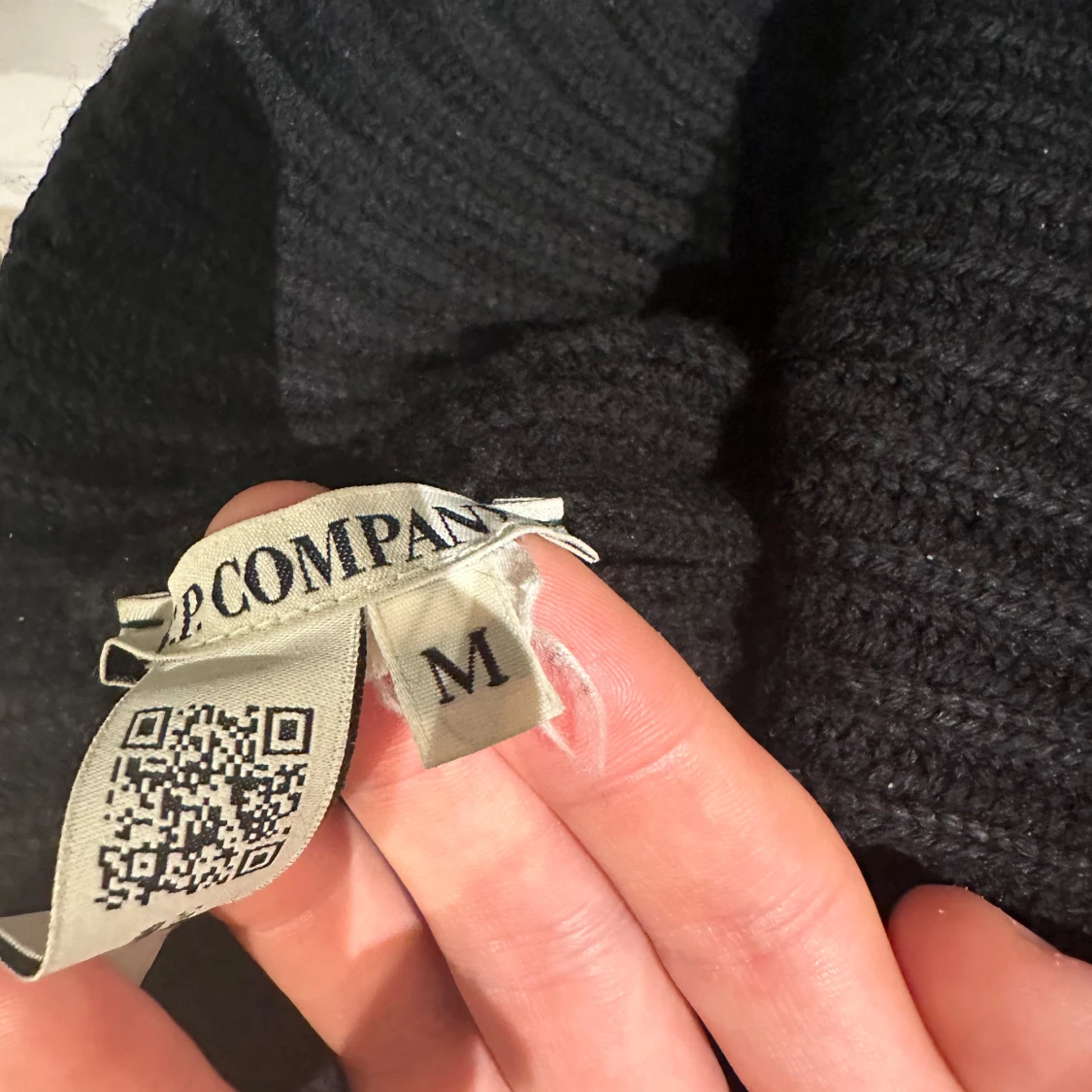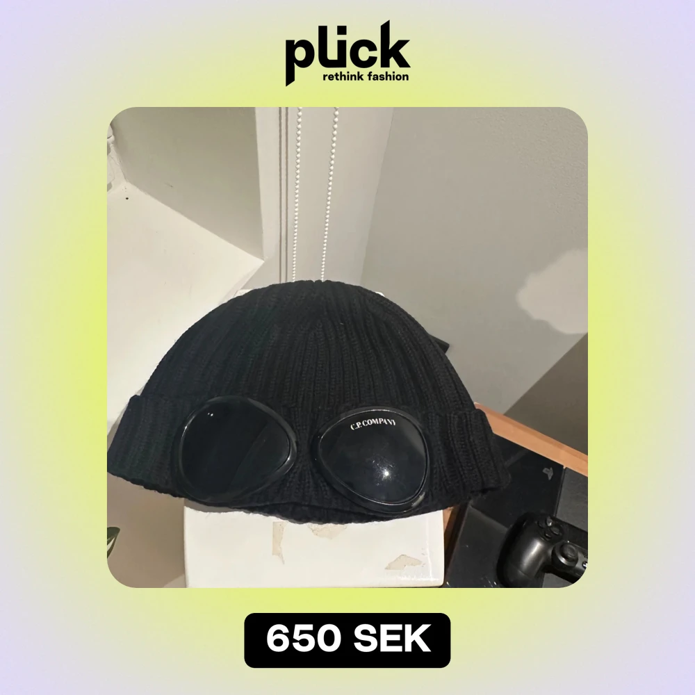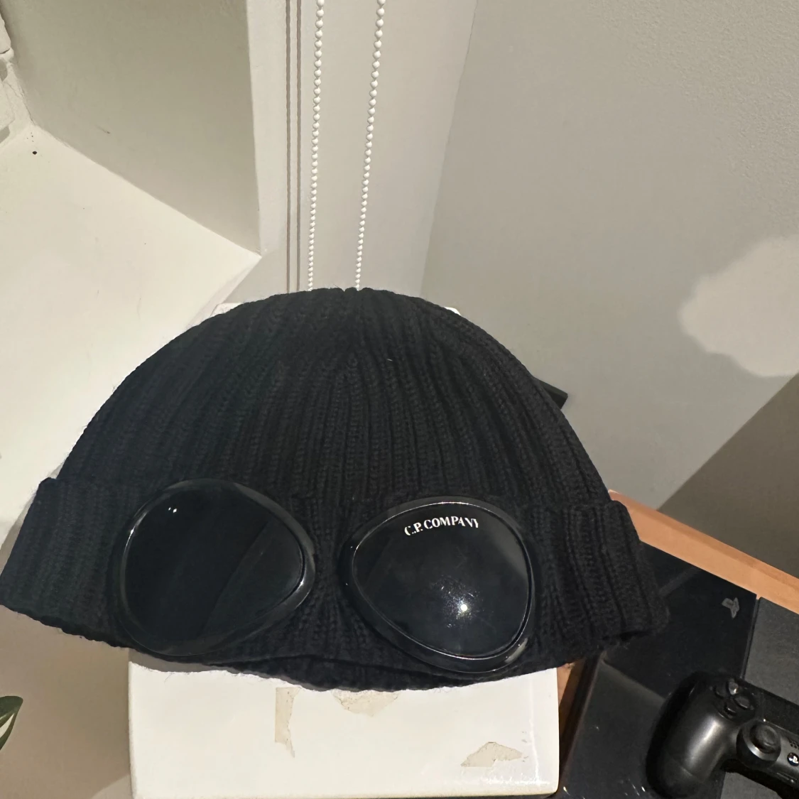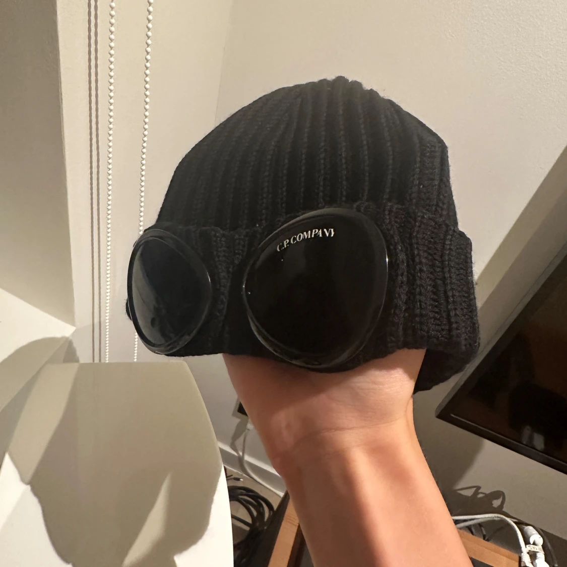 Säljer en svart stickad mössa från C.P. Company med coola glasögondetaljer framtill. Perfekt för att hålla sig varm och stilren under kalla dagar. Mössan är i bra skick och passar perfekt för vintern. Den har en ribbad design som ger en skön passform.
